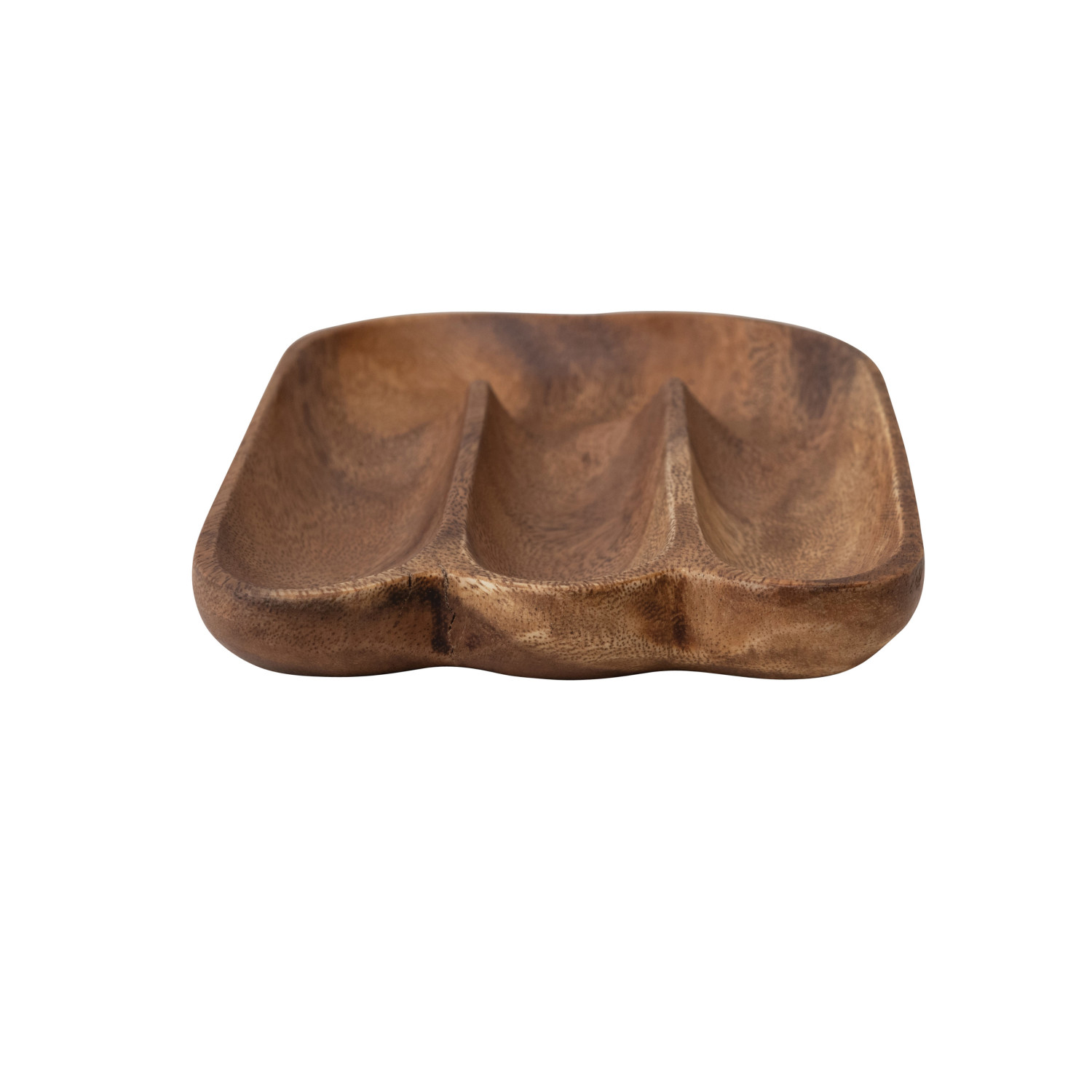 This strikingly modern acacia wood tray showcases 3 intricately carved sections.