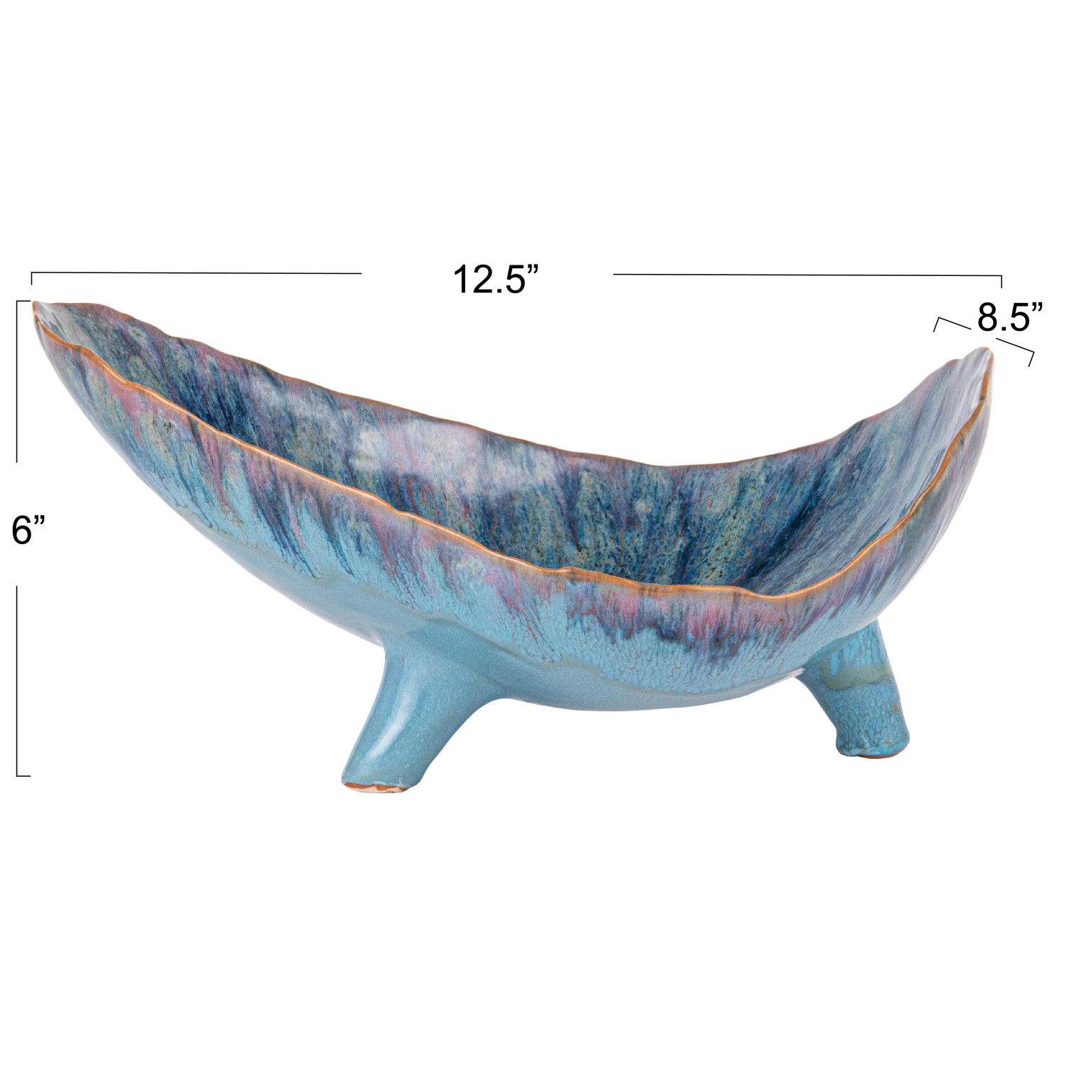 This Azure Footed Stoneware Bowl is a blend of natural form and mesmerizing color. The reactive glaze creates a dynamic blue pattern, with each bowl offering a distinct look that varies from piece to piece. The 12.50 inches in length, 8.50 inches in width, and 6.00 inches in height make it a versatile choice for both serving and showcasing, while the food-safe material ensures it's ready for any occasion. Whether filled with fresh produce or left empty to admire its beauty, this bowl stands out with its elevated design and captivating hue, making it a cherished addition to any home. Its organic shape and footed base combine to create a piece that's as much a conversation starter as it is a functional item.