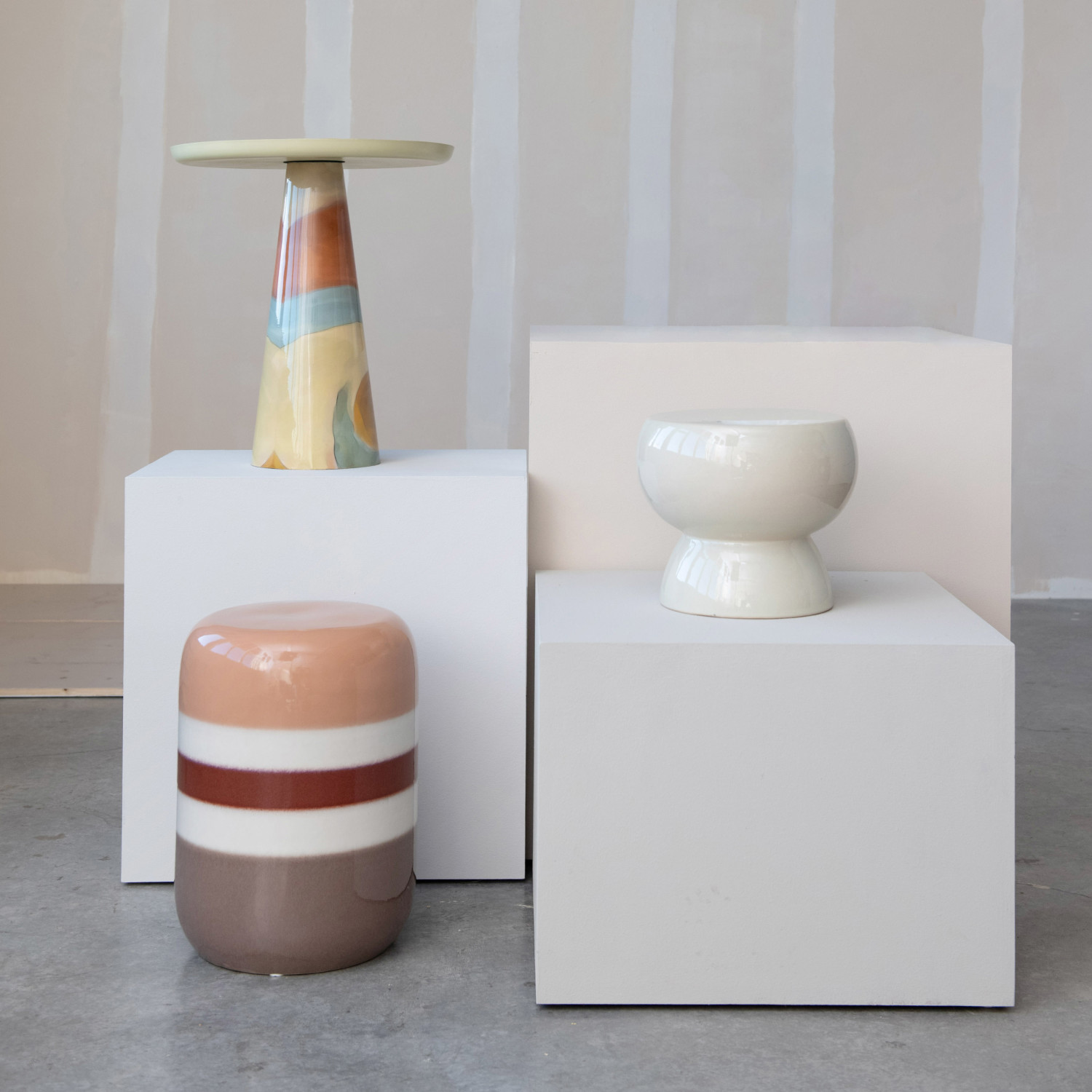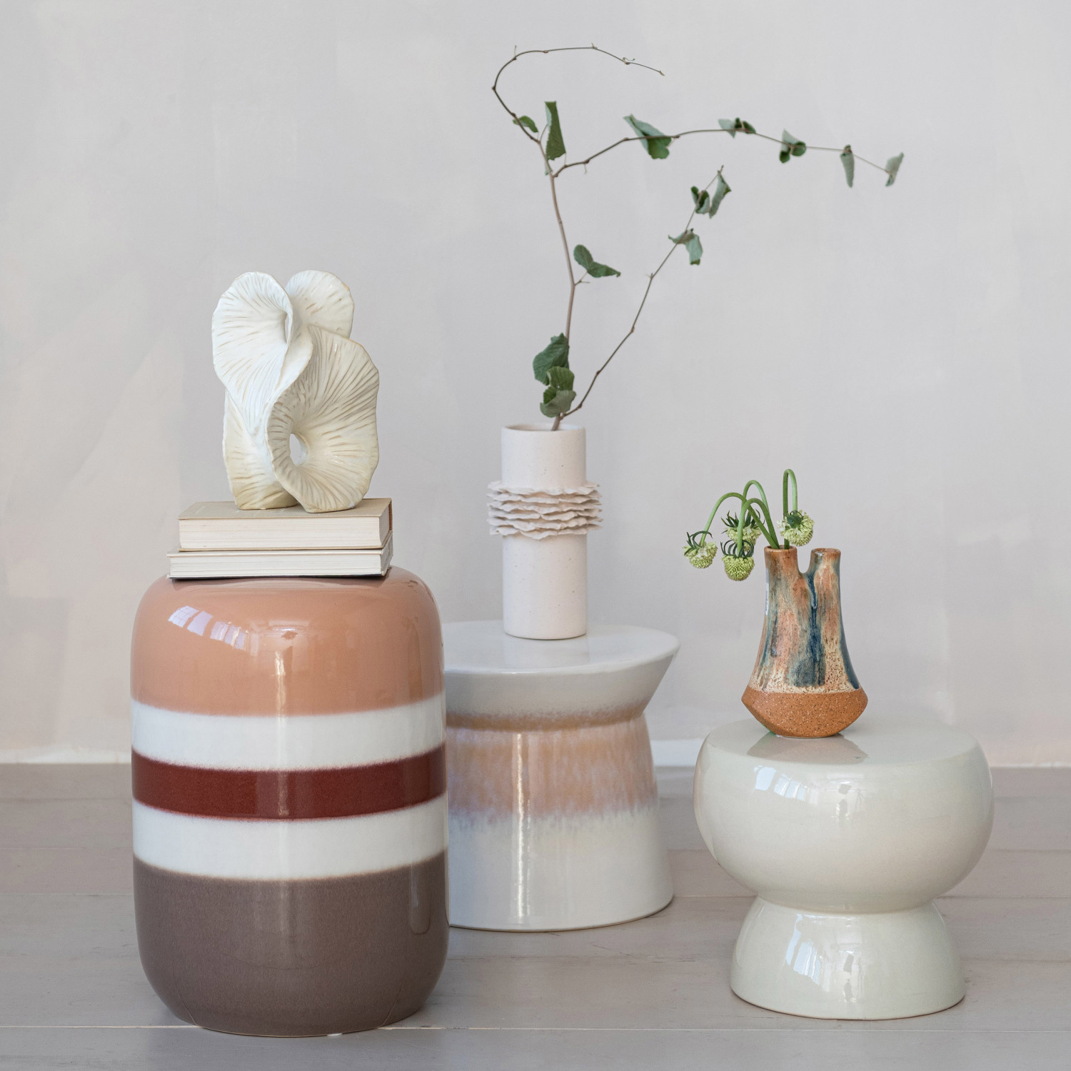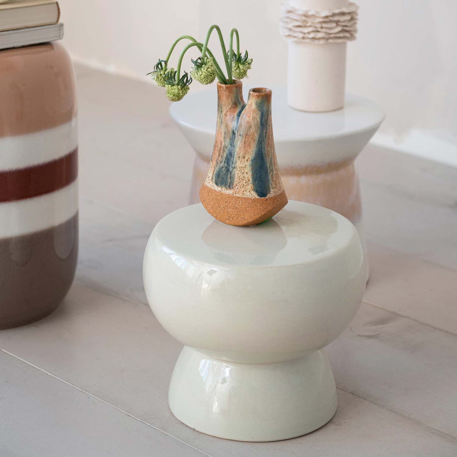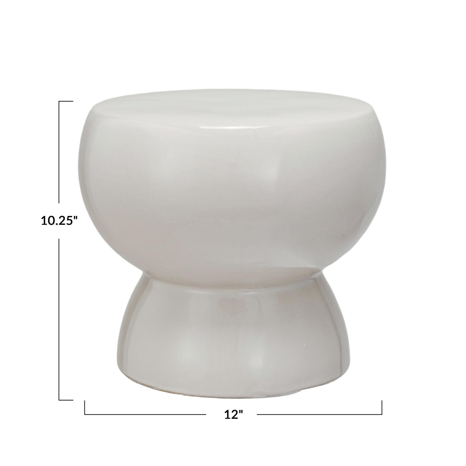 Catalog Name: 12" Round x 10-1/4"H Stoneware Stool/Pedestal, Reactive Glaze, Cream Color, Truck Ship (Each One Will Vary)