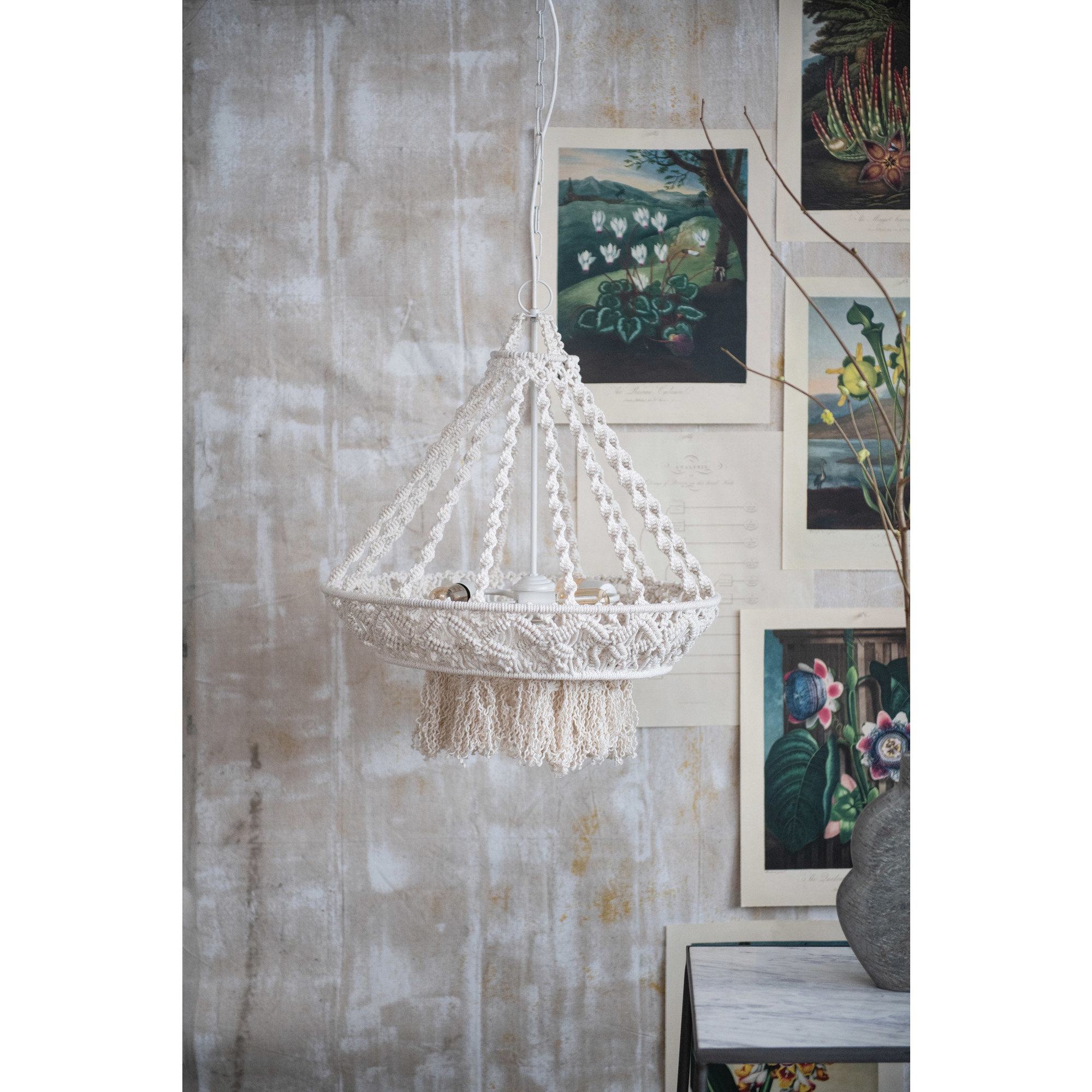 Boho vibes can be felt with the addition of this natural cotton macramé pendant light. Handwoven with intricate patterns, it also features long fringe at the bottom. Add this gorgeous light to an entranceway or bedroom and pair with a piece of decorative macramé wall art. Also perfect for hanging above a kitchen counter or dining room table. Requires one 40 Watt bulb, not included, and hardwire connection.