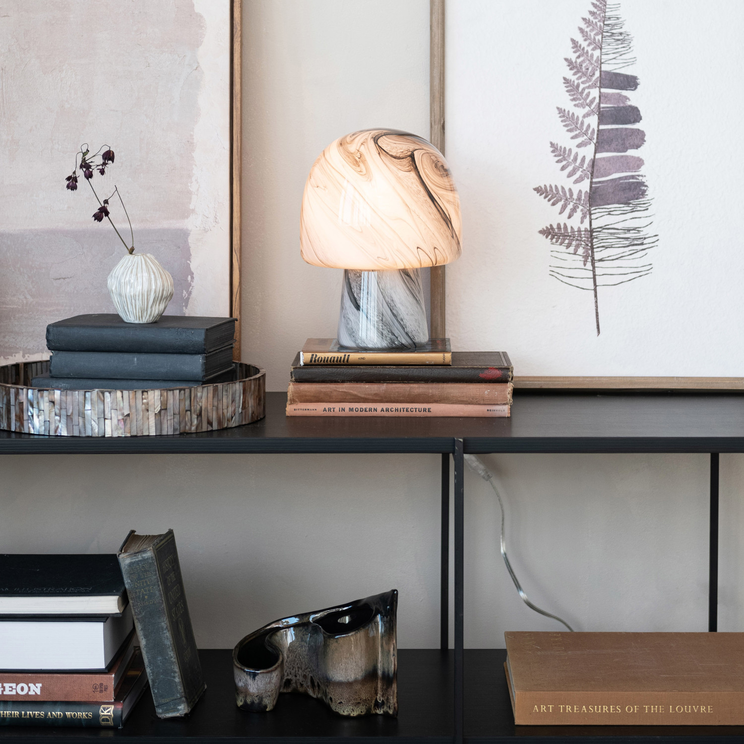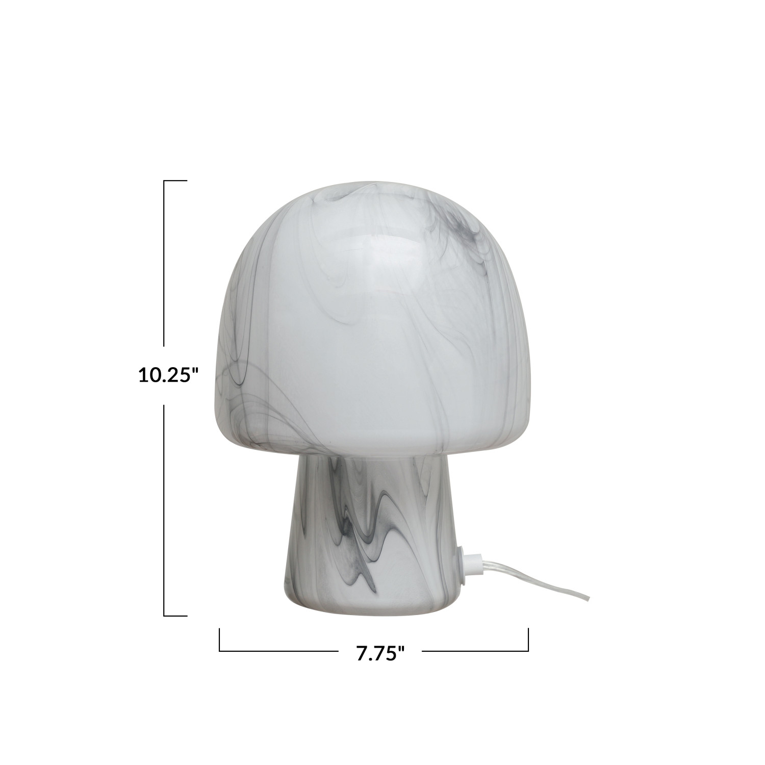 Catalog Name: 7-3/4" Round x 10-1/4"H Hand-Blown Art Glass Mushroom Shaped Table Lamp w/ Inline Switch, Black & White