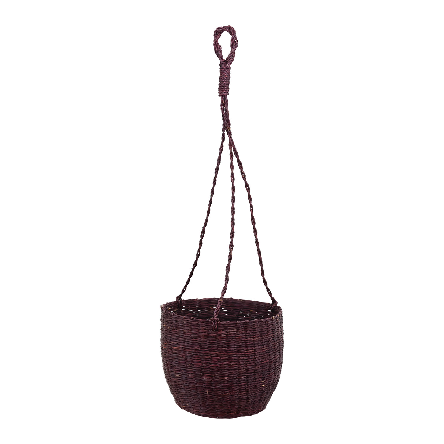 Catalog Name: 8" Round x 6-3/4"H Hanging Hand-Woven Seagrass Basket/Planter, Eggplant Color (Holds 7" Pot)