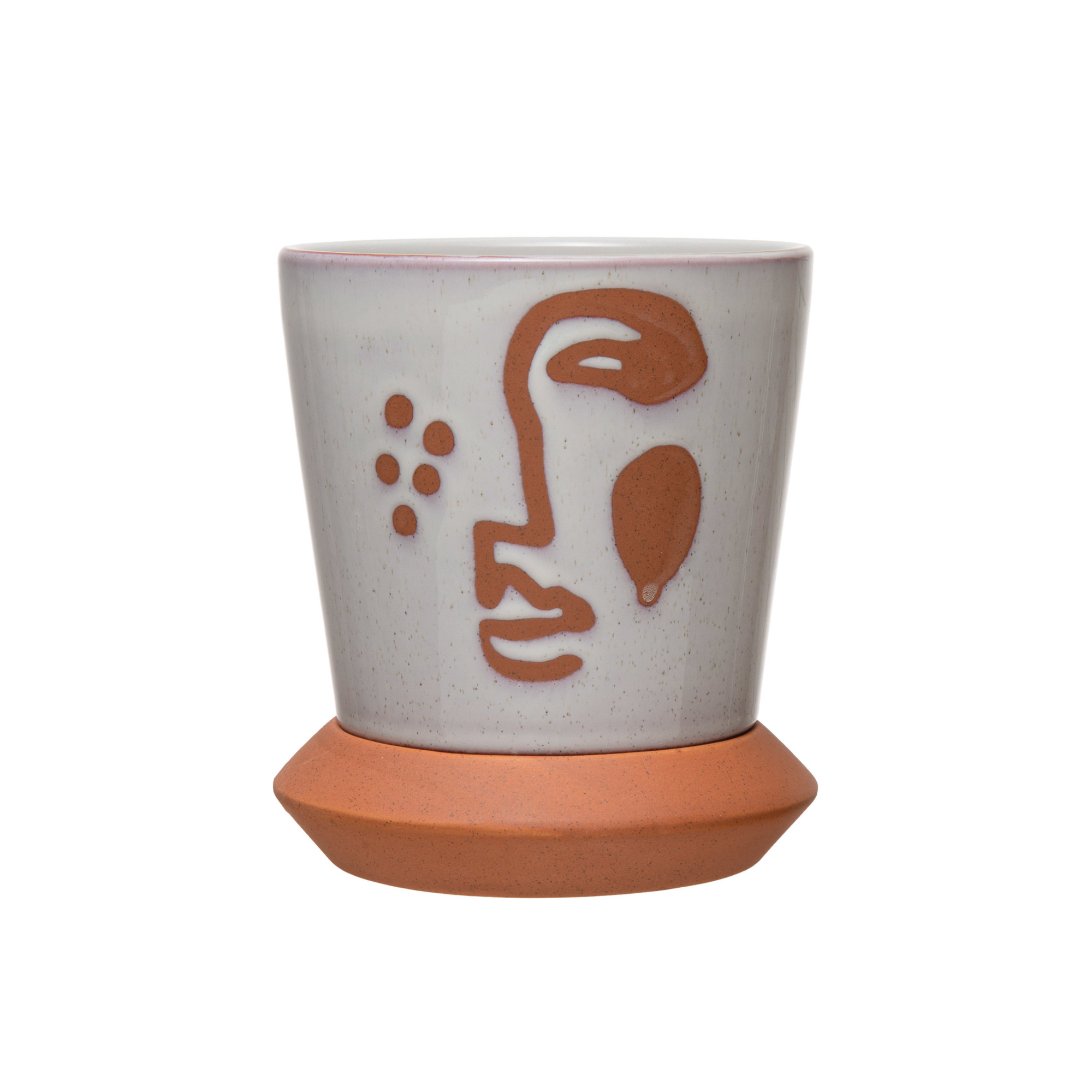 Catalog Name: 4-3/4" Round x 5-1/2"H Stoneware Planter w/ Face & Saucer, White & Terra-cotta Color, Set of 2 (Holds 3" Pot)