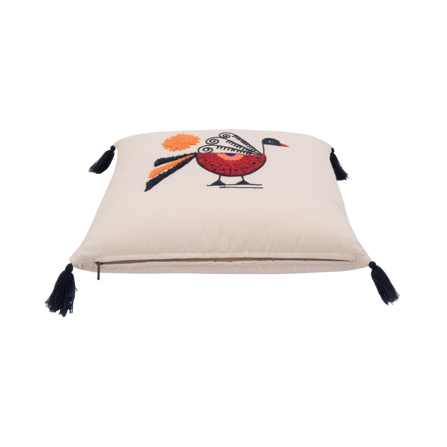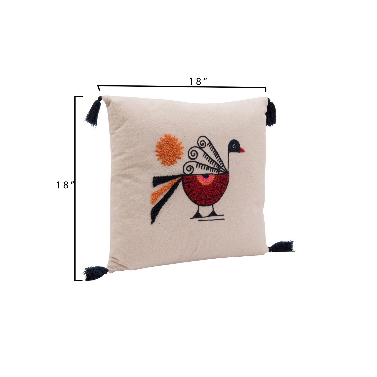 Catalog Name: 18" Square Cotton Pillow w/ Embroidered Peacock & Tassels, Multi Color