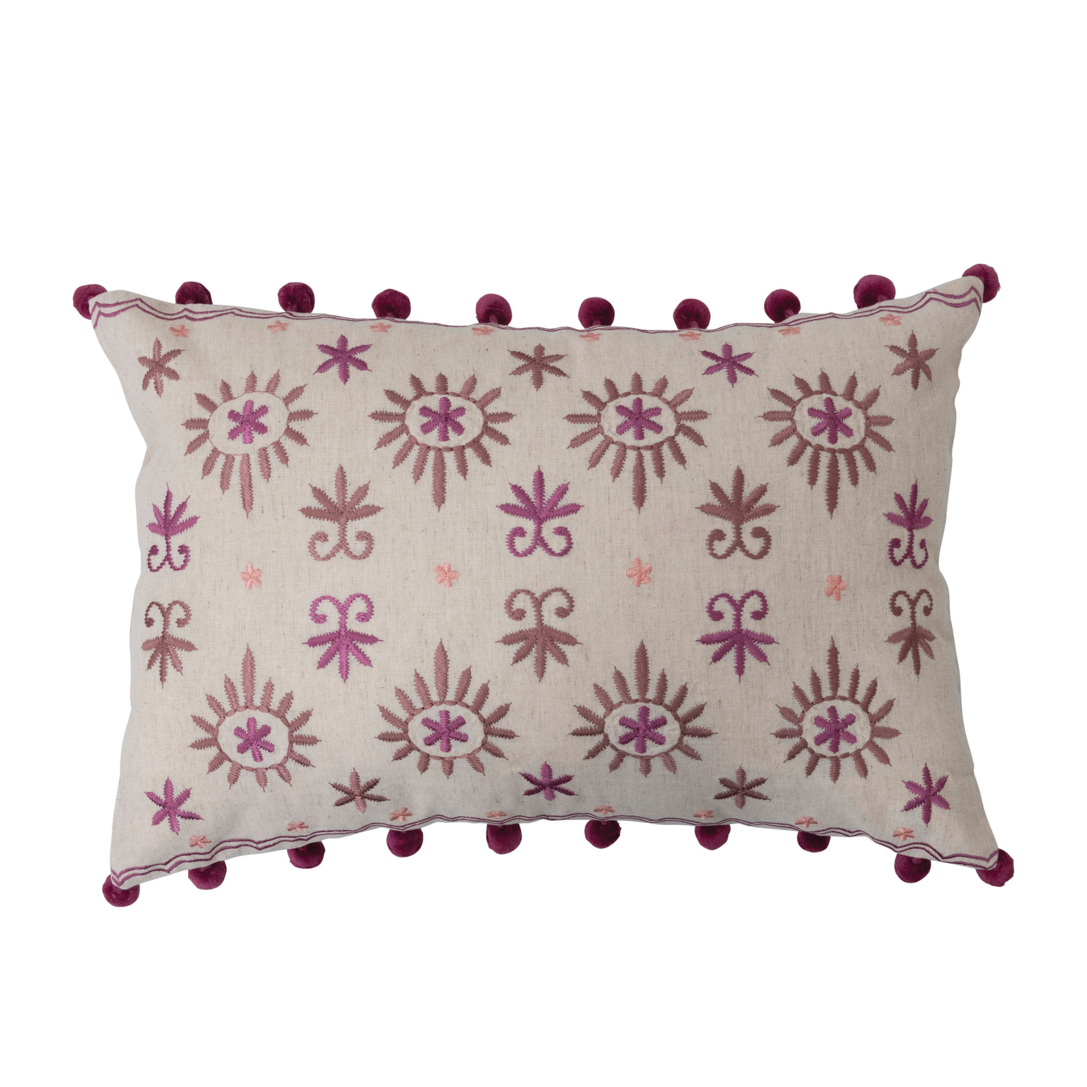 Catalog Name: 20"L x 14"H Cotton & Linen Lumbar Pillow w/ Embroidery & Pom Poms, Multi Color