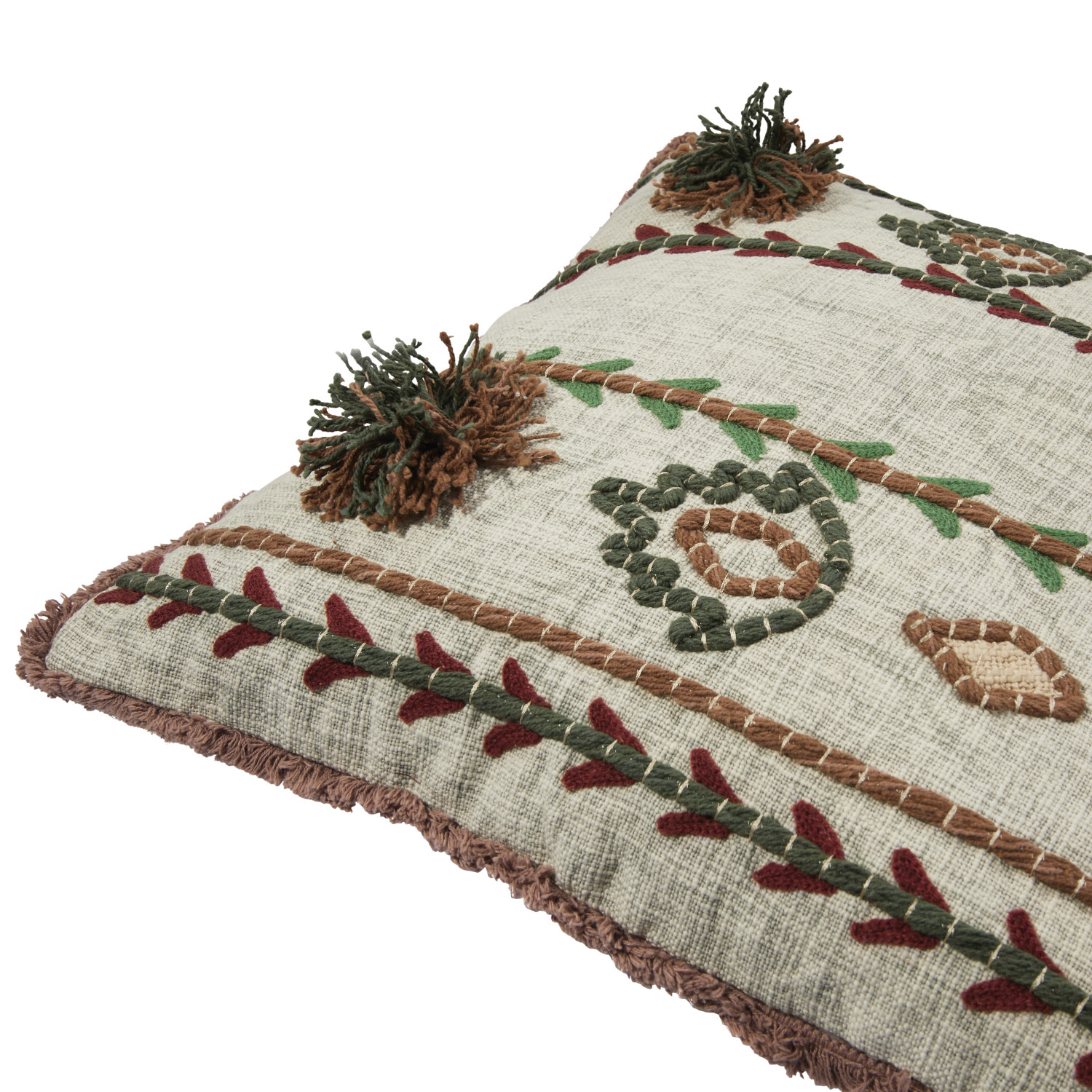 This bold, textural throw pillow cover showcases intricately embroidered patterns on woven cotton, finished with delicate fringe. Multicolor embroidered cotton throw pillow with fringe; Natural chambray on back. Express your constantly evolving style with the simple addition of this eye-catching pillow. Removable cotton throw pillow cover with polyester insert; Back zipper with hidden flap; Machine wash.