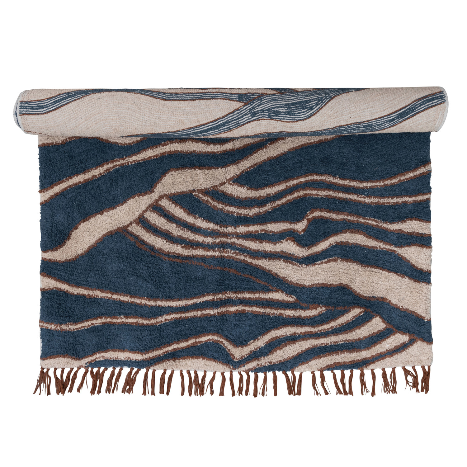 This boho inspired rug showcases supple tufted cotton with a 2-tone wave design and decorative fringe.