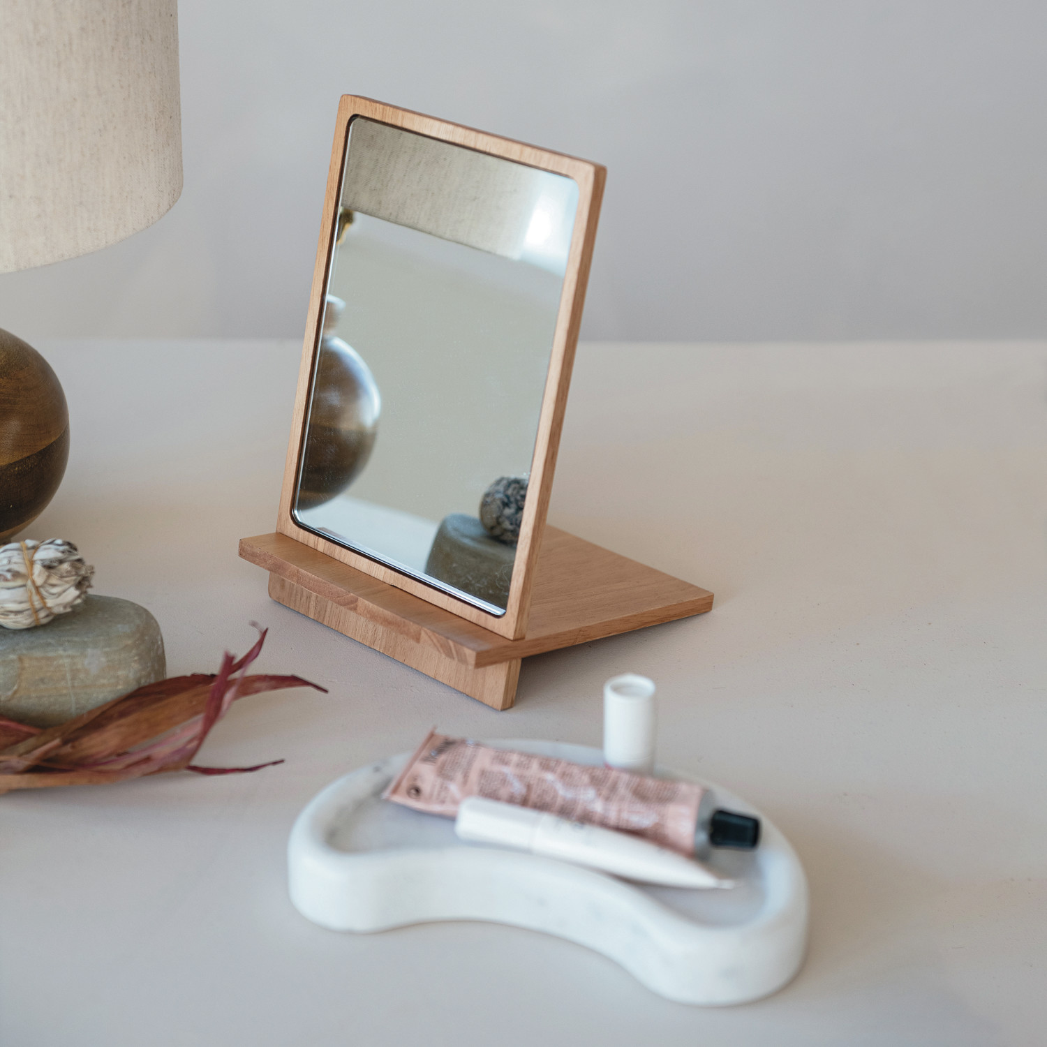 This Rubberwood Interlocking Dresser and Desk Mirror is a statement of simplicity and utility. Its interlocking design and wood stand, all in a pleasing natural tone, bring a sense of serenity to any room. The mirror measures 6.75 inches long, 6.25 inches wide, and 9.75 inches high, offering a substantial view that's perfect for a quick glance before a meeting or a detailed look while getting ready. Its rubberwood construction ensures durability, while the natural finish highlights the wood's inherent beauty, making it a timeless addition to any space. Whether placed on a dresser for accessorizing or on a desk for a last-minute appearance check, this mirror stands as a testament to tasteful functionality.