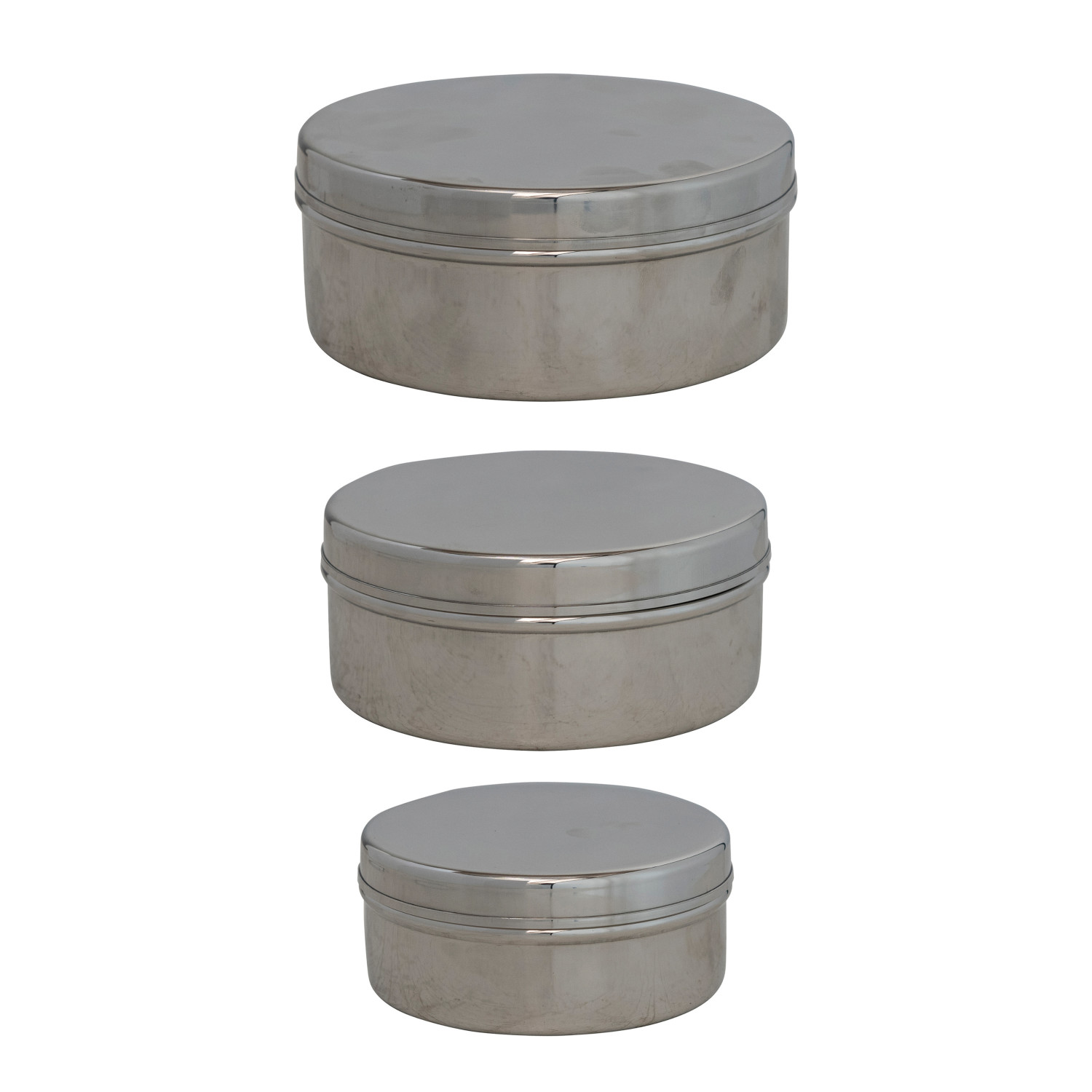 Catalog Name: 5-1/2" Round x 2-1/4"H, 5" Round x 2"H & 4-1/2" Round x 1-3/4"H Stainless Steel Containers, Set of 3