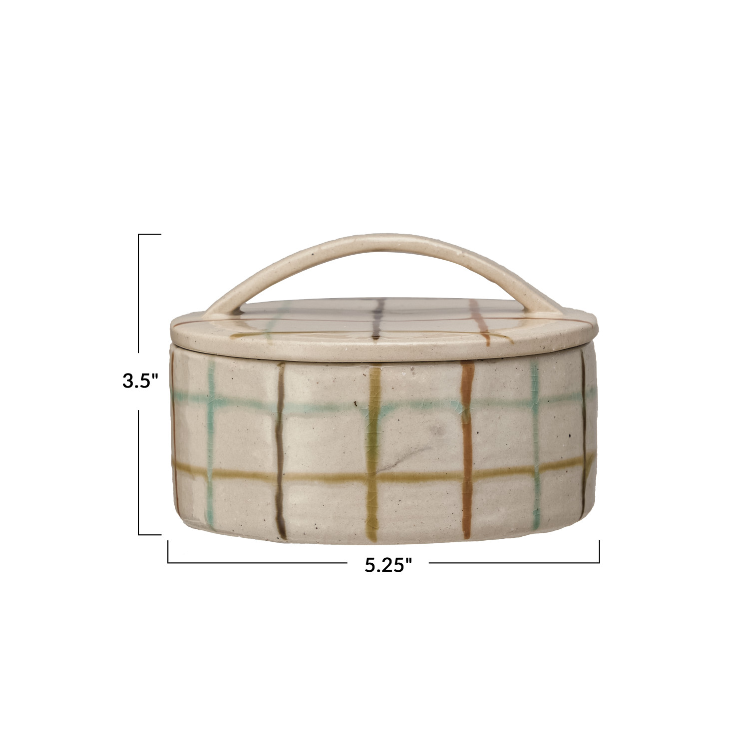 Catalog Name: 5-1/4" Round x 3-1/2"H Hand-Painted Stoneware Dish w/ Grid Pattern & Lid, Reactive Crackle Glaze, Multi Color (Each One Will Vary)
