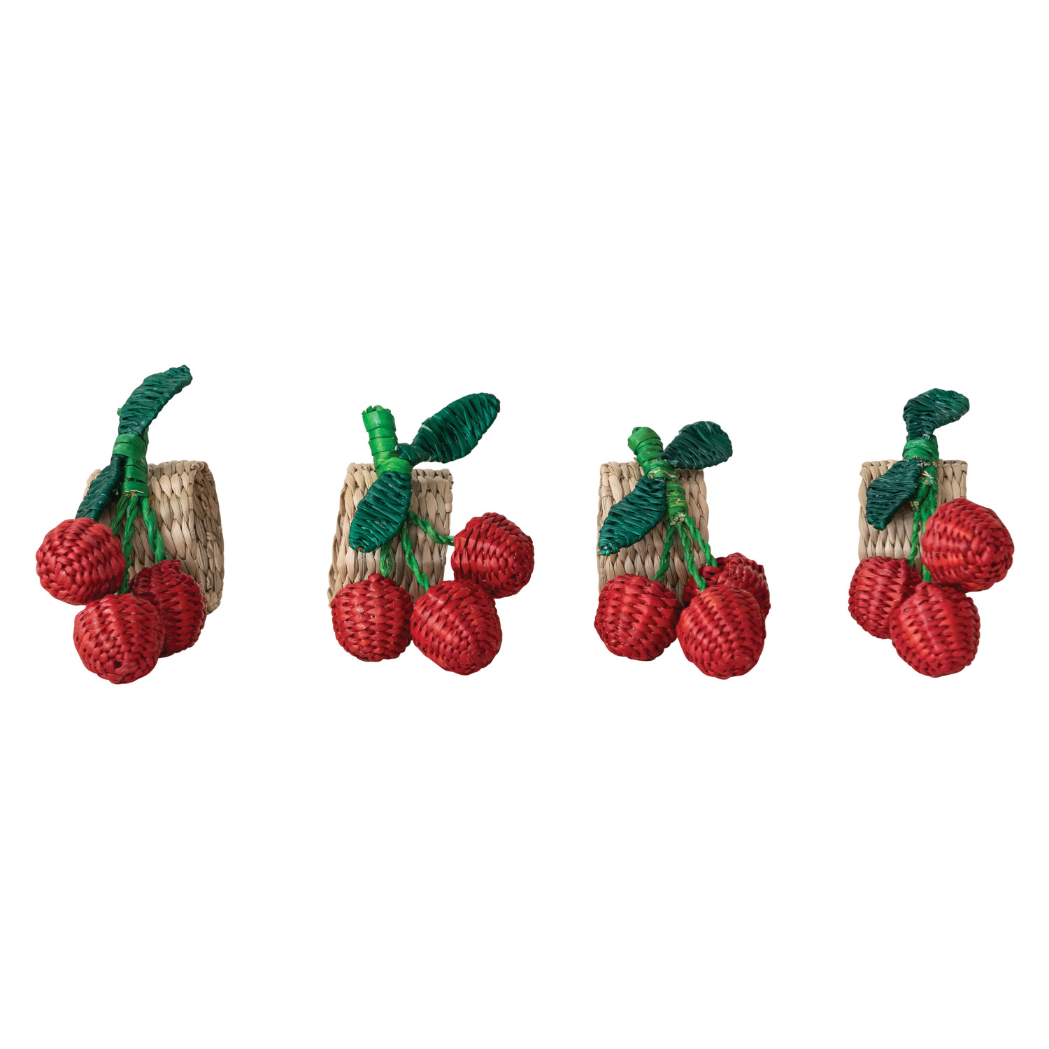 Catalog Name: 1-3/4" Round Hand-Woven Seagrass Cherry Napkin Rings, Natural, Red & Green, Set of 4 Tied w/ Jute