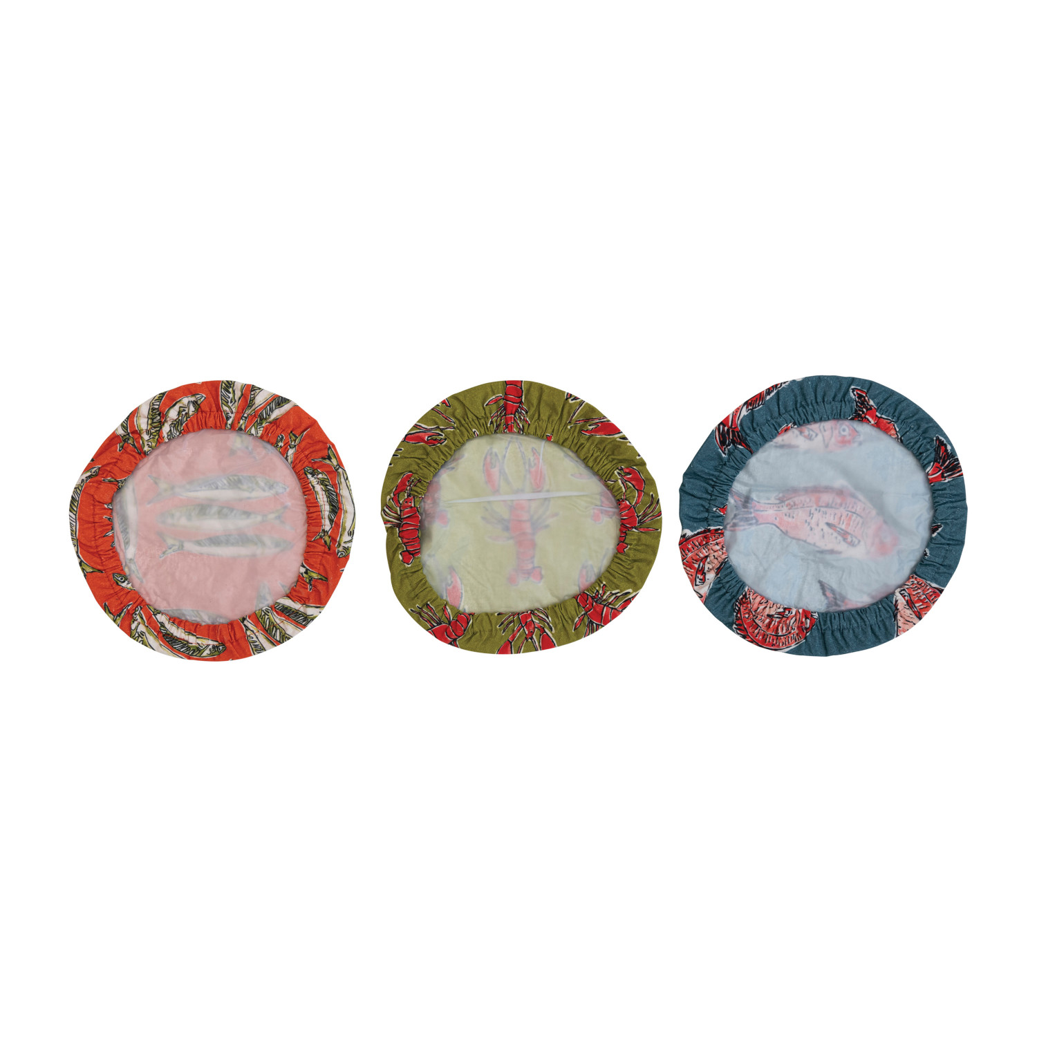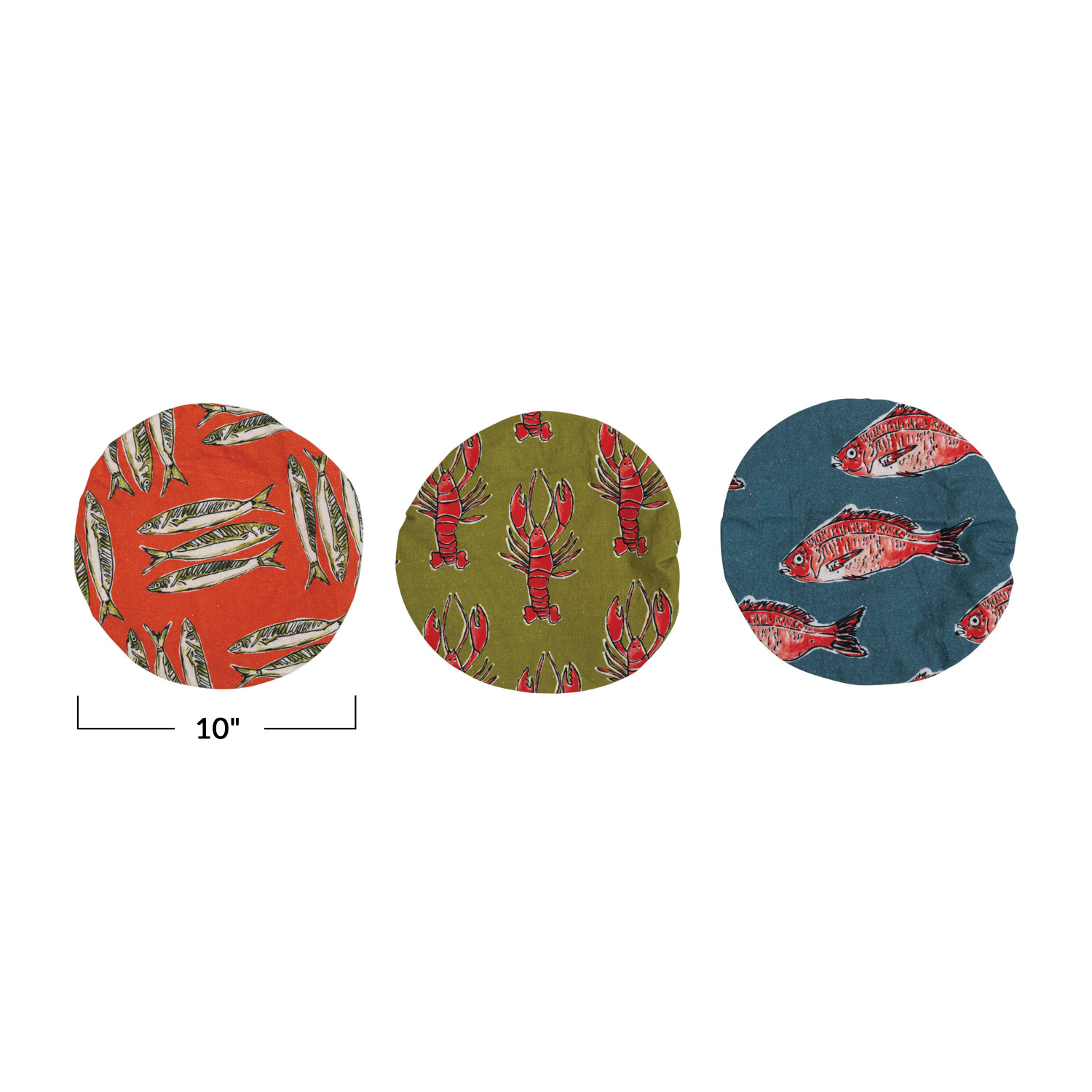 Featuring a vast selection of lush woven textures, intricate details, and timeless patterns, our collection of kitchen textiles will bring warmth and elegance to a dining space of any style. Instantly transform a breakfast nook or dining room into a sophisticated sanctuary by exploring a vast array of textiles and accessories fit for any space including table runners, napkin sets, placemats, napkin rings, tea towels, dish cloths, sponge cloths, pot holders, food pouches, aprons, and so much more. Choose from a wide variety of luxurious fabrics from cotton and velvet to linen and seagrass, and styles from mid-century modern and boho to classic farmhouse and contemporary. This nautical set of lined cotton bowl covers features 3 styles of sea life illustrations in playful hues. Display in a living or dining space of any style from coastal to French country. Machine Wash Cold Gentle Cycle, Do Not Bleach, Tumble Dry Low, Do Not Iron, Or Turn Inside Out, Clean with Damp Cloth or Running Water, Wipe with Dry Cloth or Air Dry. Made from cotton.