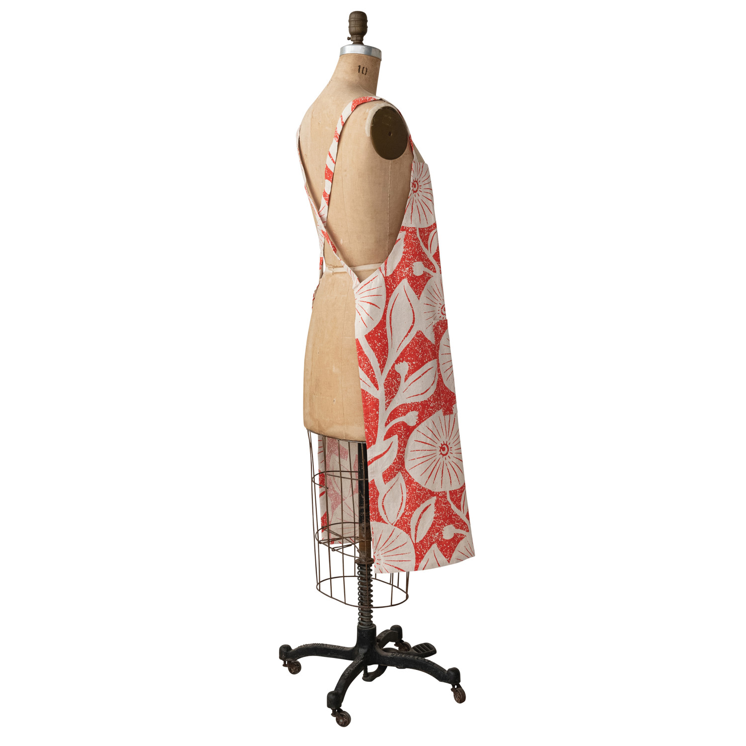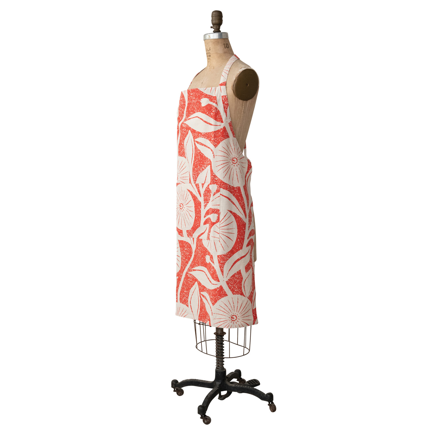 Cotton Printed Crossback Apron w/ Floral Pattern & Pocket, Natural & Tomato Color