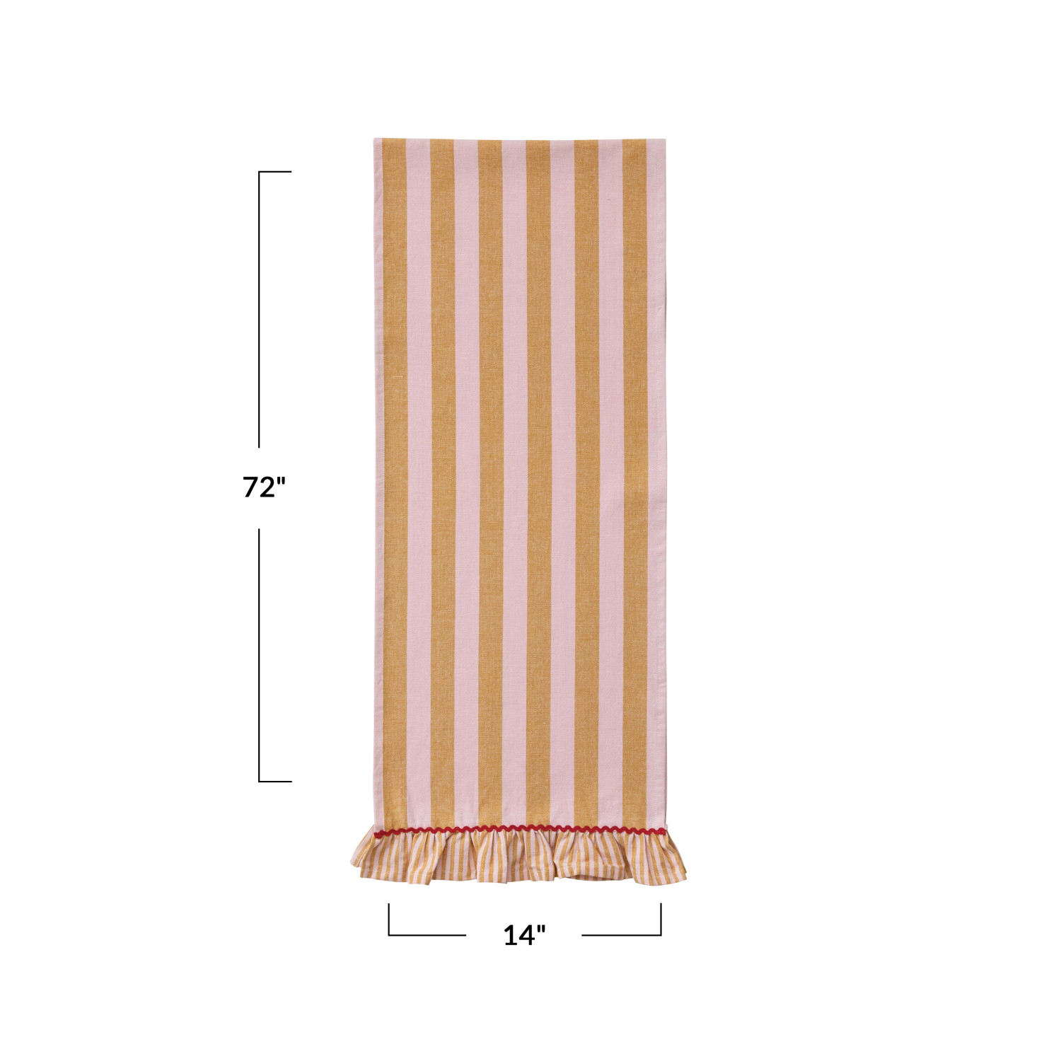 Catalog Name: 72"L x 14"W Woven Cotton Striped Table Runner w/ Ruffle & Ric Rac Trim, Mustard Color, Pink & Red