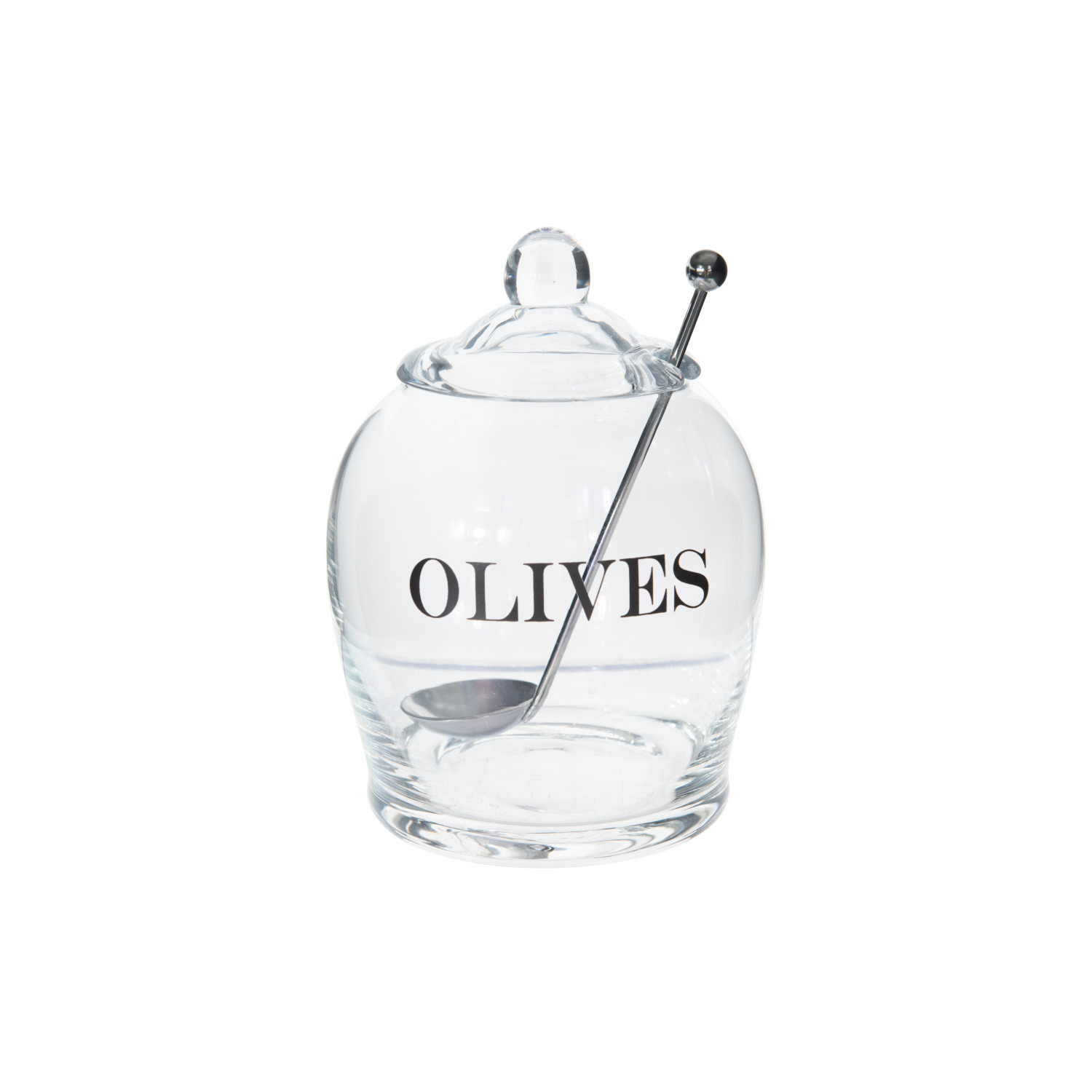 If olives are a delicacy in your home, this clear glass jar is a must. It features an attractive shape along with a decorative glass lid and has the word "OLIVES" written across the front. A small opening in the side of the lid allows the included stainless steel spoon to stay in the container even while the lid is on.