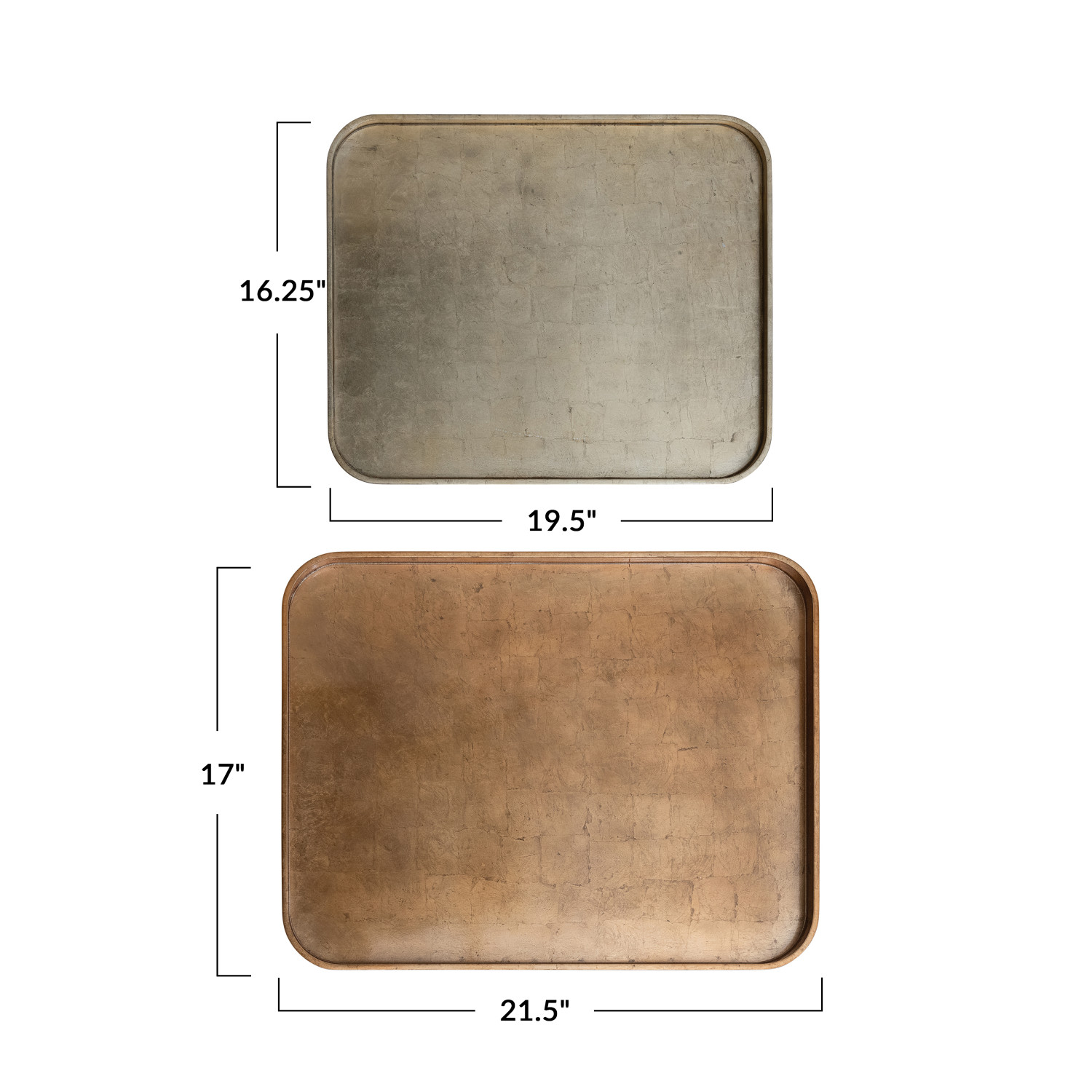 Catalog Name: 21-1/2"L x 17"W & 19-1/2"L x 16-1/4"W MDF Lacquered Trays w/ Foil, Copper & Gold Finish, Set of 2