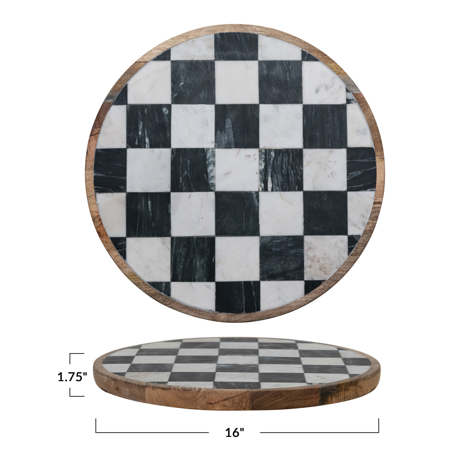 Catalog Name: 16" Round x 1-3/4"H Mango Wood & Marble Check Lazy Susan, White, Black & Natural (Each One Will Vary)