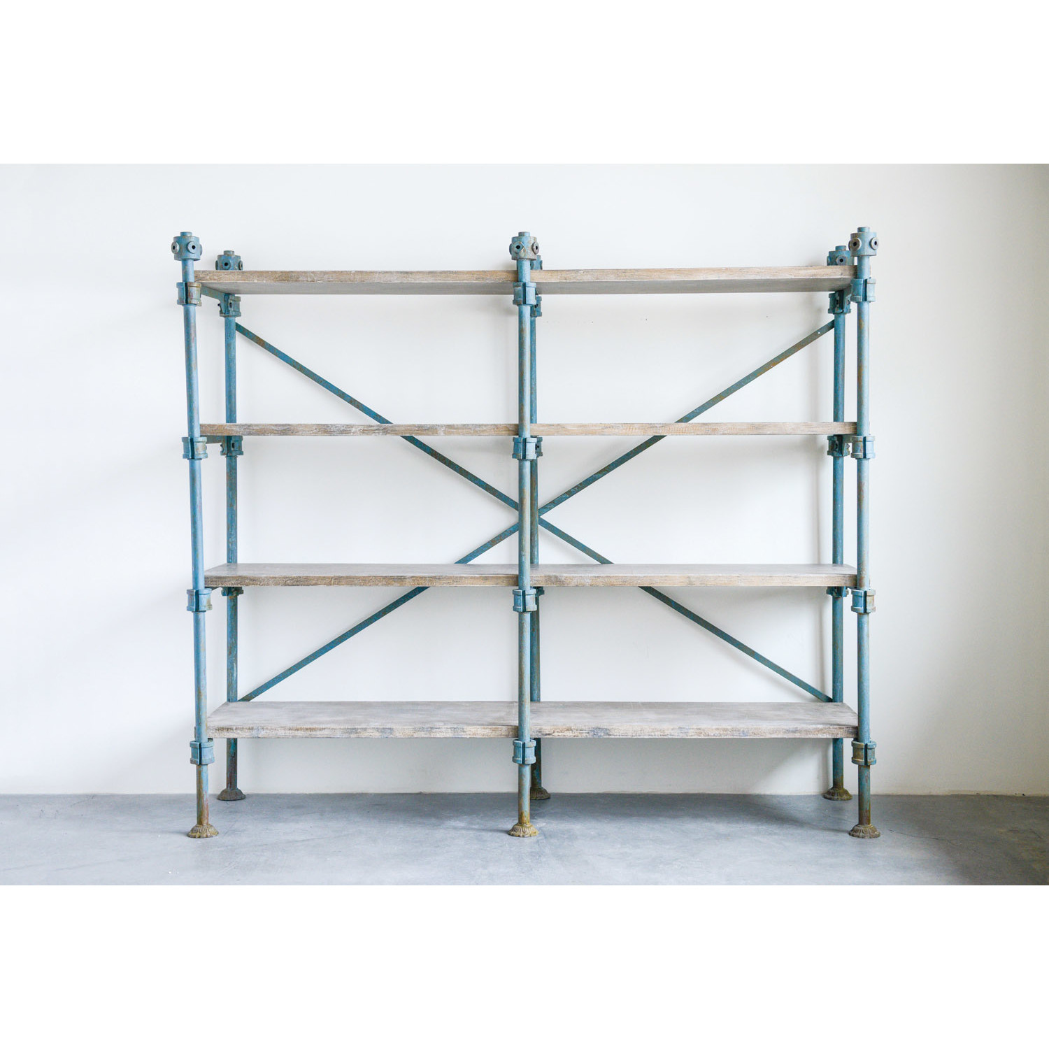 Never again need more shelf space! This wonderful unit has 4 large shelves. The shelves are made of wood with distressed blue metal supports.