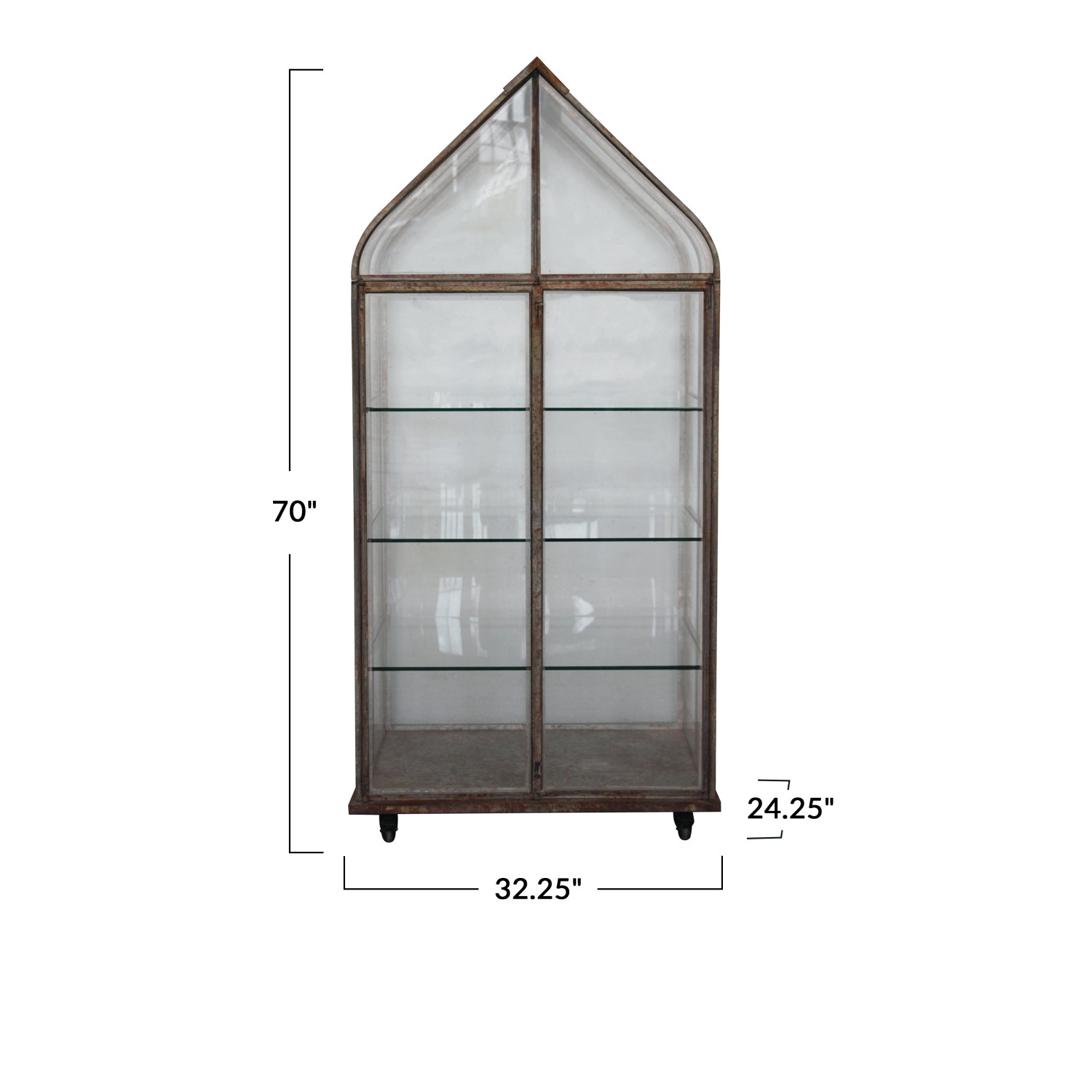 Catalog Name: 32-1/4"L x 24-1/4"W x 70"H Metal & Acrylic Terrarium on Casters w/ 3 Glass Shelves, Heavily Distressed Finish, KD, Truck Ship (Each One Will Vary)
