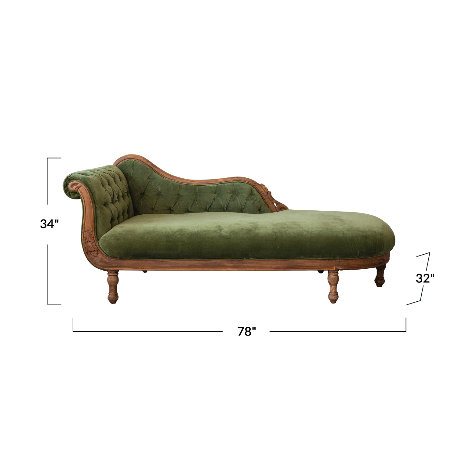 Indulge in luxury and comfort with this green velvet chaise lounge. This exquisite piece of furniture features soft cotton velvet upholstery that feels smooth and cozy to the touch. The rich green color adds a pop of vibrancy and elegance to any space. The carved wood frame showcases intricate details and a warm walnut finish that enhances the beauty and craftsmanship of this chaise lounge. Whether curling up with a good book, taking a nap, or simply relaxing, this chaise lounge offers a spacious and comfortable seat that conforms to the body. It measures 78 inches in length, 32 inches in width, and 34 inches in height. This chaise lounge is easy to assemble and durable, making it a great addition to the home.