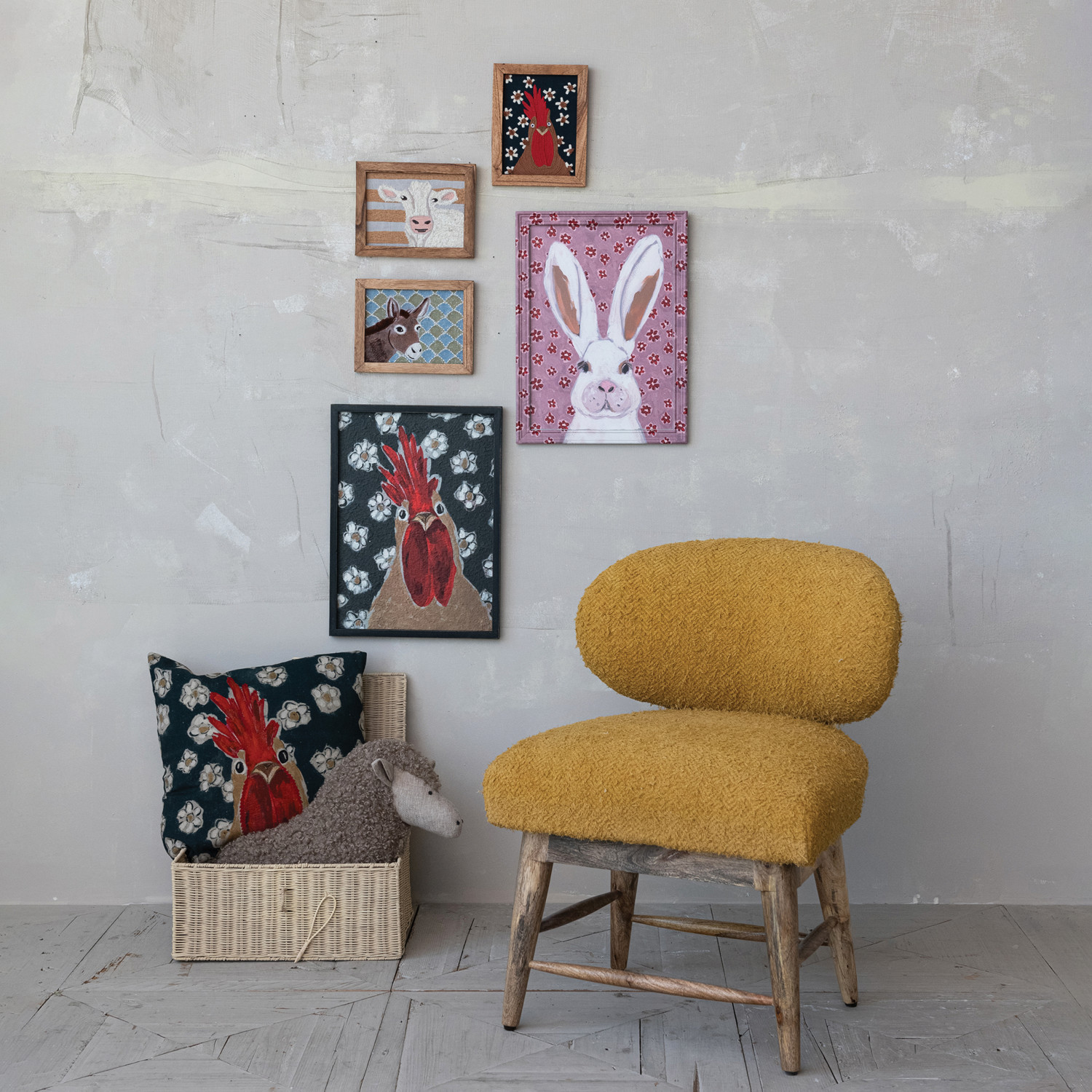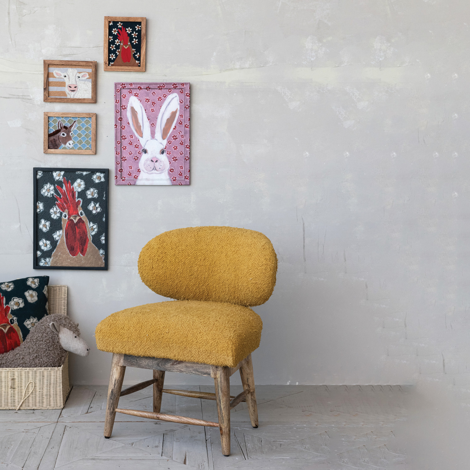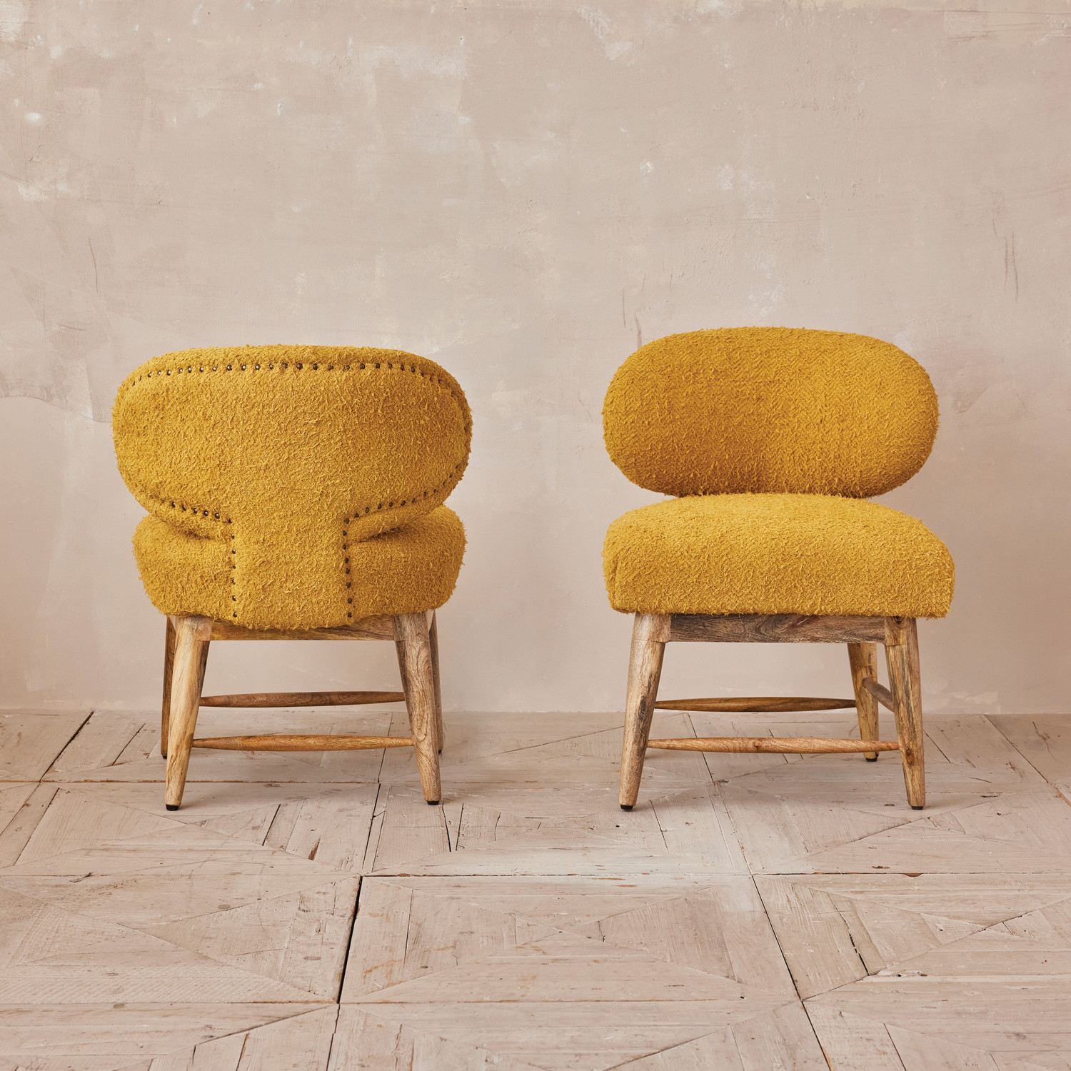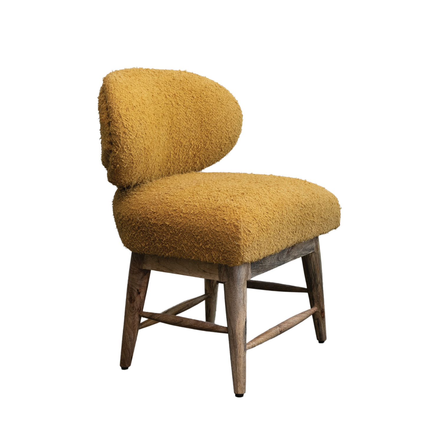 Catalog Name: 24"W x 22-1/2"D x 31-1/2"H Mango Wood & Cotton Bouclé Upholstered Chair w/ Nail Heads, Mustard Color & Natural, Truck Ship