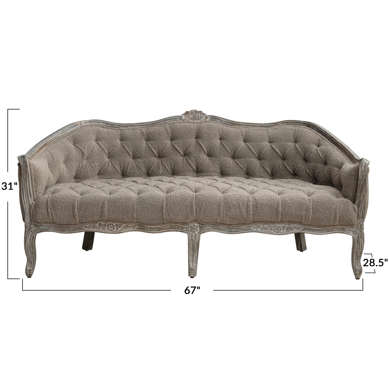 Catalog Name: 67"W x 28-1/2"D x 31"H Bouclé Fabric Upholstered Pintucked Sofa w/ Hand-Carved Mango Wood Frame, Brown & Antique Grey, Truck Ship