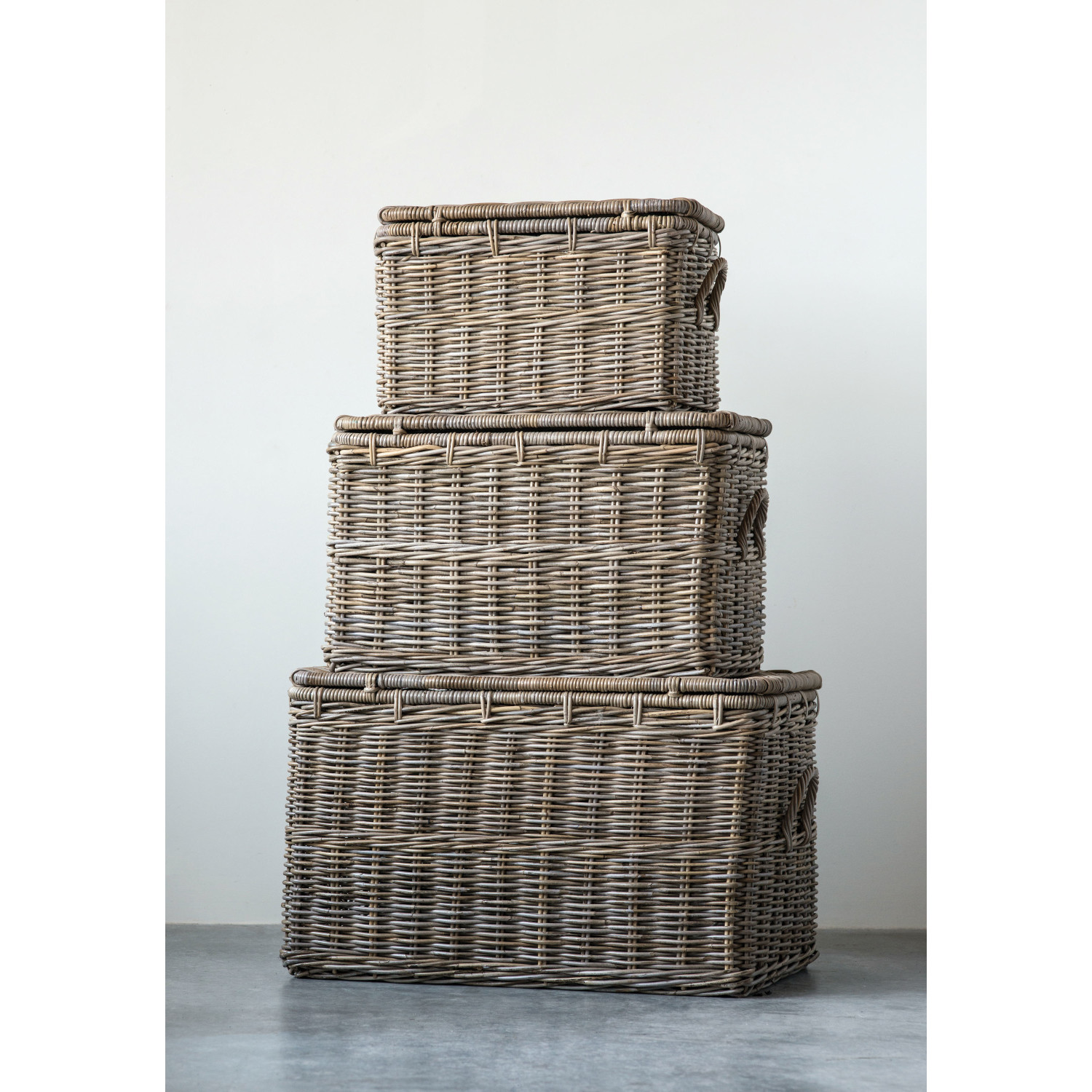 Catalog Name: 36"L x 22-1/2"W x 22"H, 30-1/2"L x 19-1/4"W x 18-3/4"H & 24"L x 15-1/4"W x 14-3/4"H Rattan Nesting Baskets w/ Lids & Leather Buckles, Natural, Set of 3, Truck Ship