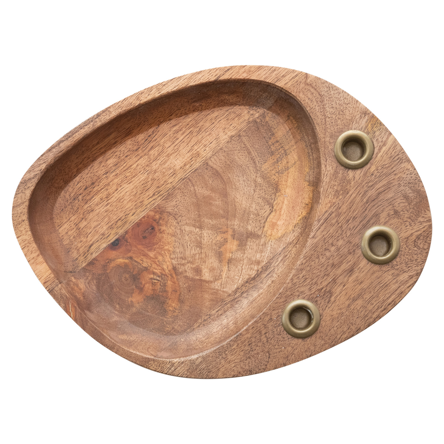 Catalog Name: 9-1/4"L x 7"W x 1-1/4"H Mango Wood & Metal Taper Holder w/ Tray, Gold Finish & Natural (Holds (3) 1/2" Tapers)