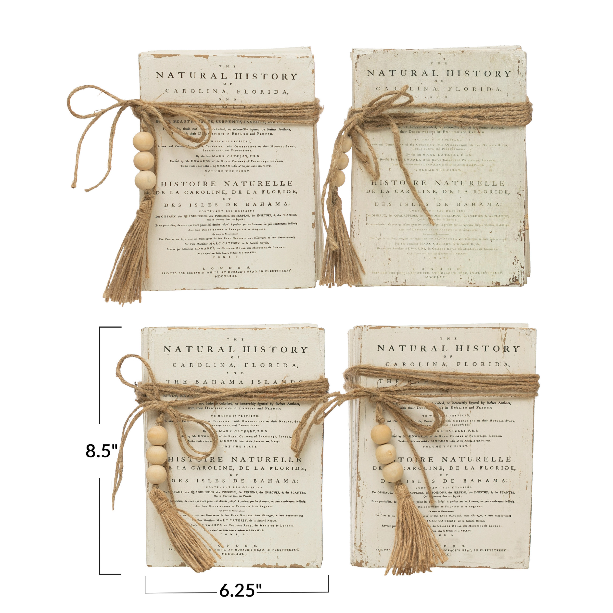 Catalog Name: 8-1/2"L x 6-1/4"W x 3-1/4"H Wood Faux Book Blocks w/ Saying, Wood Beads & Jute Tie, White, 4 Styles