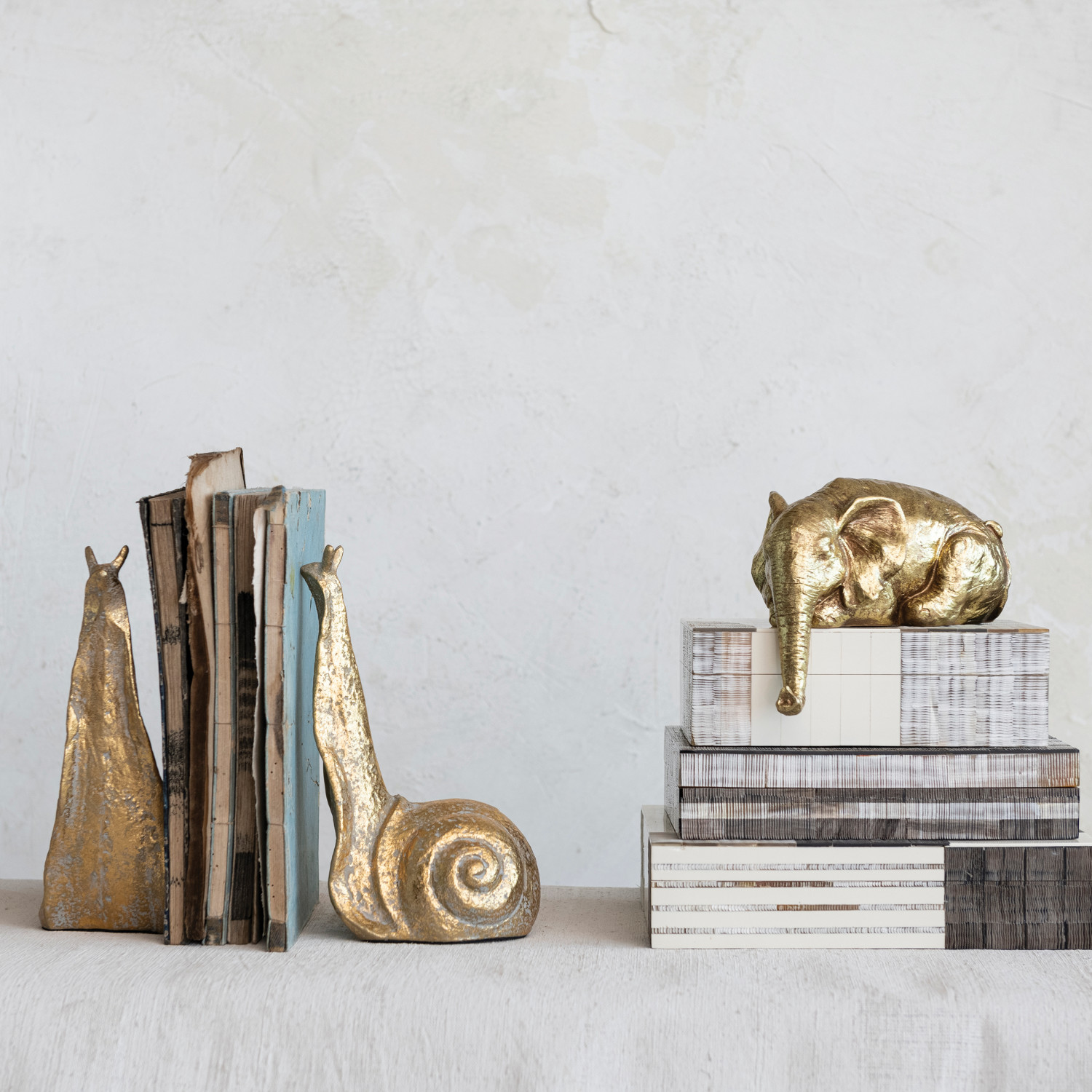 These distressed gold cast metal snail bookends are a fun and unique way to organize and decorate the book collection. They are made of cast metal, which is a sturdy and heavy material that can hold up books of different sizes and weights. They have the silhouette of two snails, which are symbols of patience and perseverance. They have a distressed gold finish that gives them a shimmering and antique look, adding some cottage-inspired charm and whimsy to the home décor. They can be used as a set or separately for display. They are suitable for any cottage, farmhouse, or rustic style of home décor, as they complement any color scheme and material. They are great for animal lovers or book enthusiasts. Each bookend measures 5.25 inches long, 3.5 inches wide, and 9 inches high. To maintain their beauty, simply wipe them with a dry cloth. These bookends are a versatile and stylish addition to any home. Add some cottage-inspired charm and whimsy to the bookshelf with these distressed gold cast metal snail bookends. These bookends are suitable for any cottage, farmhouse, or rustic style of home décor, as they create a cozy and playful look. They feature the silhouette of two snails, perfect for any animal lovers or book enthusiasts. The bookend measures 5.25 inches long, 3.5 inches wide, and 9 inches high.