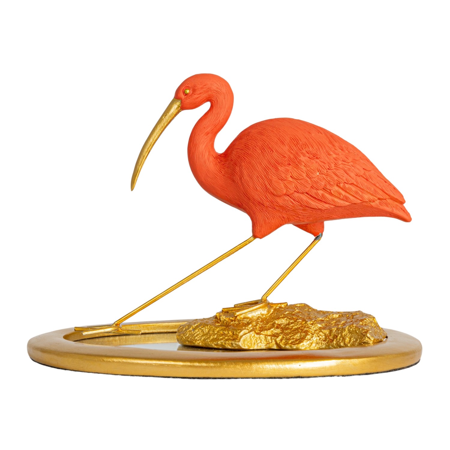 Catalog Name: 10"L x 8-1/4"W x 7"H Resin Scarlet Ibis on Mirrored Tray, Gold Finish & Coral Color