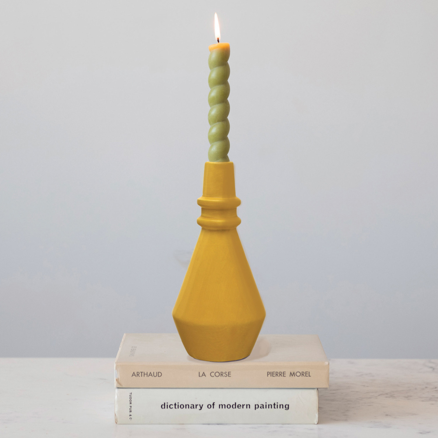 A stylish and sturdy taper holder that features a round base and a mustard color. This taper holder is ideal for a modern, bohemian, or eclectic style home decor. This taper holder can be placed on a mantelpiece, dining table, console table, or any other surface that needs some warmth and charm. Made of stoneware.