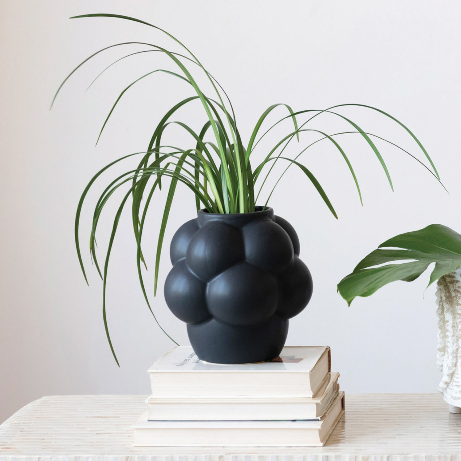 A modern and elegant stoneware vase that has raised dots on the surface and a matte black finish. This vase is suitable for any minimalist, industrial, or urban style home décor. The vase can hold water and fresh or artificial flowers, creating a striking contrast with the black color. Made of stoneware.