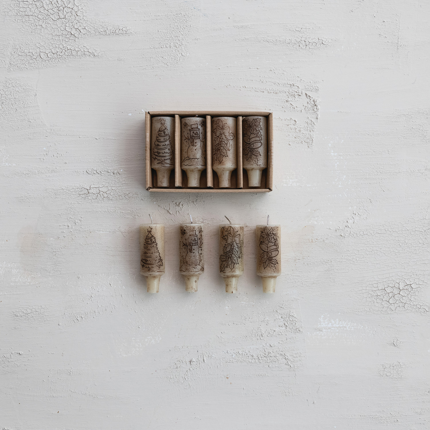 Unscented Bottle Taper Candles in Box with Design, Set of 4