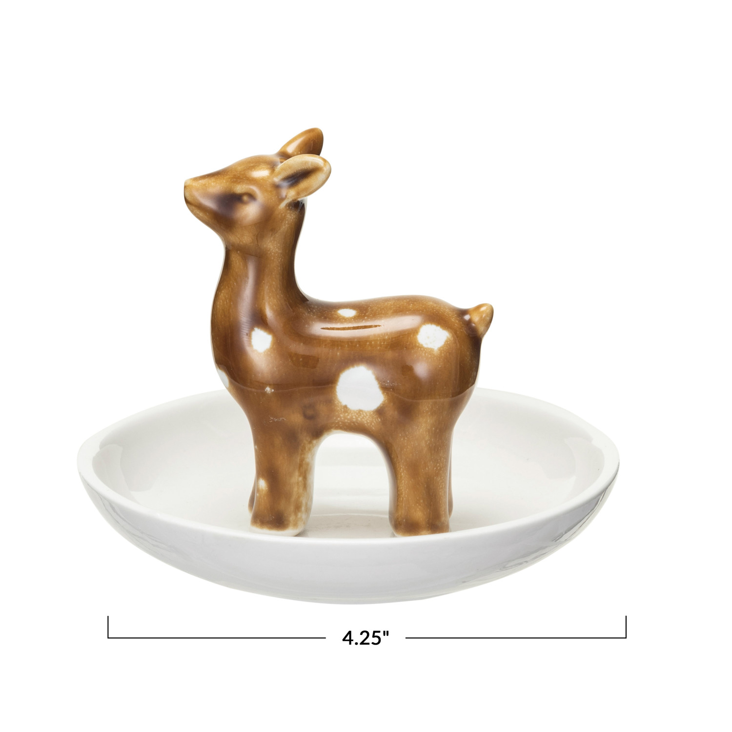 This decorative stoneware dish with deer and reactive glaze in white and brown is a cute and cozy piece that will enhance the home decor. The dish features a white and brown color that adds some contrast and elegance to any space. The dish also features a deer design that adds some charm and character, creating a stunning and unique display. The dish is made of sturdy and durable stoneware with a reactive glaze that creates a unique and glossy finish. Each one will vary slightly. The dish is ideal for serving snacks, candies, or displaying jewelry, coins, or other small items. It is a lovely and versatile piece that can add some charm and warmth to any decor style or occasion. The dish measures 4.25 inches in diameter. This piece is a great way to wow or indulge anyone. A cute and cozy stoneware dish with a deer design, a reactive glaze, and a white and brown color. A lovely and versatile piece that can add some charm and warmth to any decor style and occasion. Ideal for serving snacks, candies, or displaying jewelry, coins, or other small items.