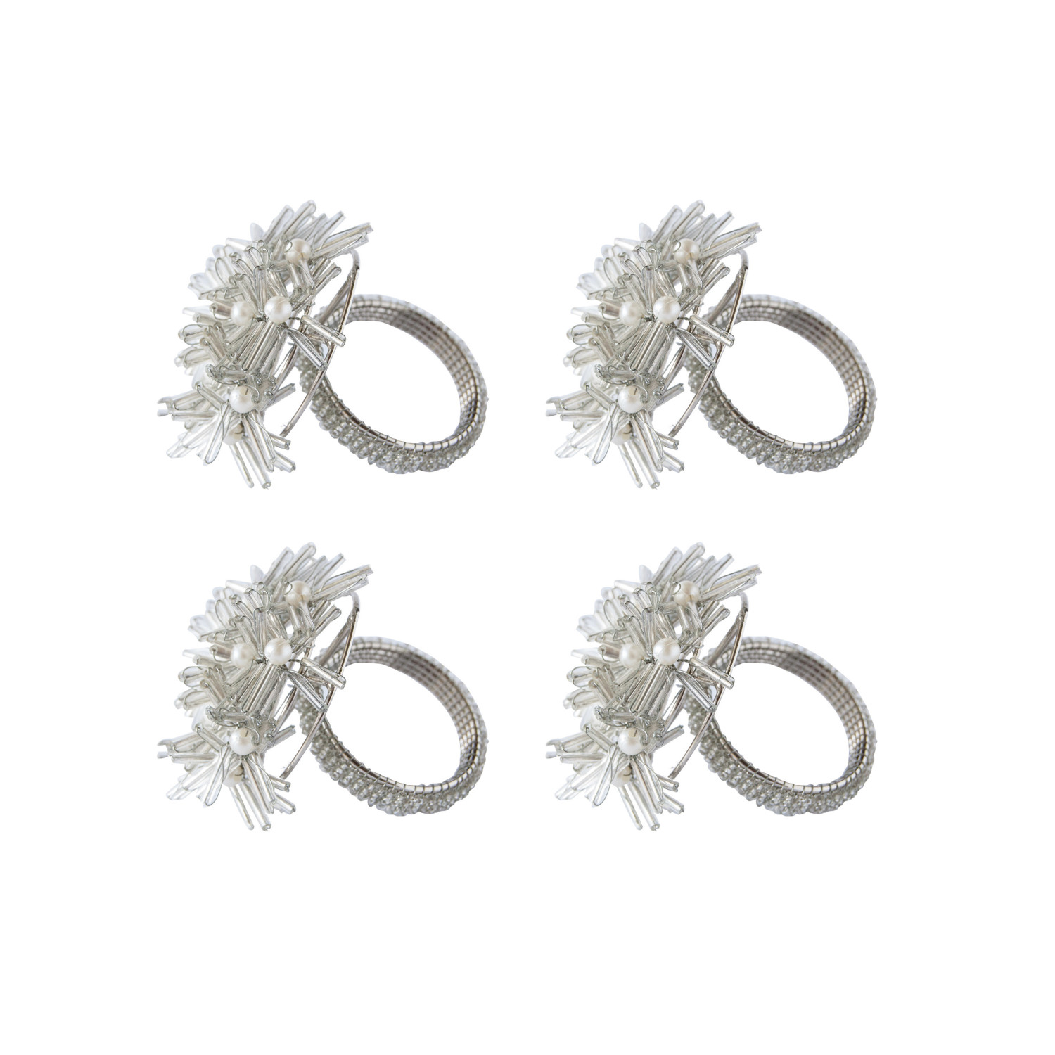 Catalog Name: 2-1/2"H Glass Beaded Metal Floral Napkin Rings, Silver Finish, Set of 4