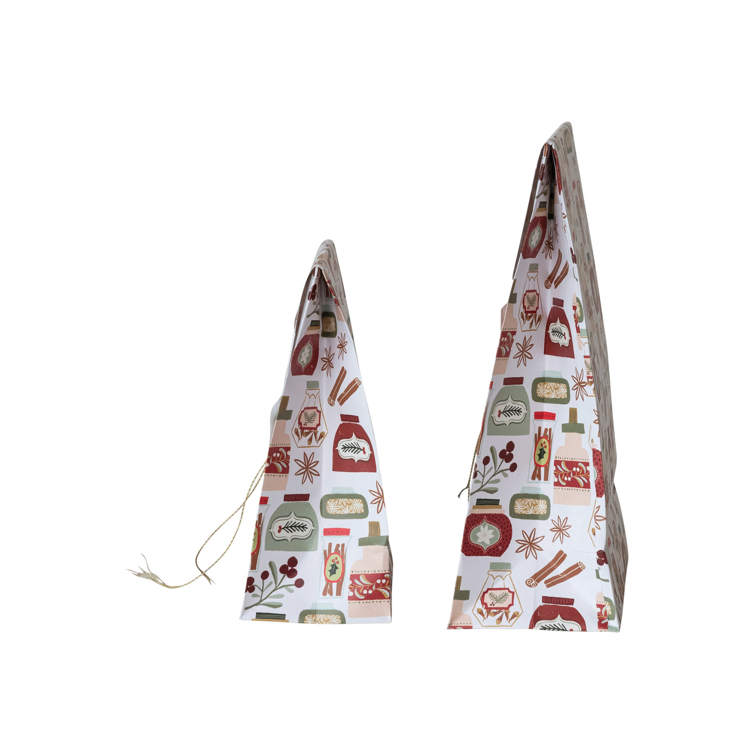 This set of 2 printed paper gift bags is the perfect wrapping solution for the holiday season. The multi-colored patterns adorned with brass accents give these bags a touch of sophistication, while the brass handles ensure durability and easy carrying. The larger bag measures 9 inches in length, 4 inches in width, and 11.5 inches in height, and the smaller one is 6.5 inches long, 3.5 inches wide, and 8.5 inches high, making them ideal for gifts of different sizes. Whether it's for a secret Santa, a thoughtful gift for a loved one, or a token of appreciation for a colleague, these bags will make every present stand out under the Christmas tree. A duo of paper gift bags, each boasting a vibrant holiday pattern and brass detailing, ready to spread festive cheer. An excellent choice for seasonal gifting, these bags elevate presents with their joyful designs and elegant brass handles. Ideal for wrapping holiday gifts, these bags are versatile for Christmas exchanges, office parties, or family gatherings.