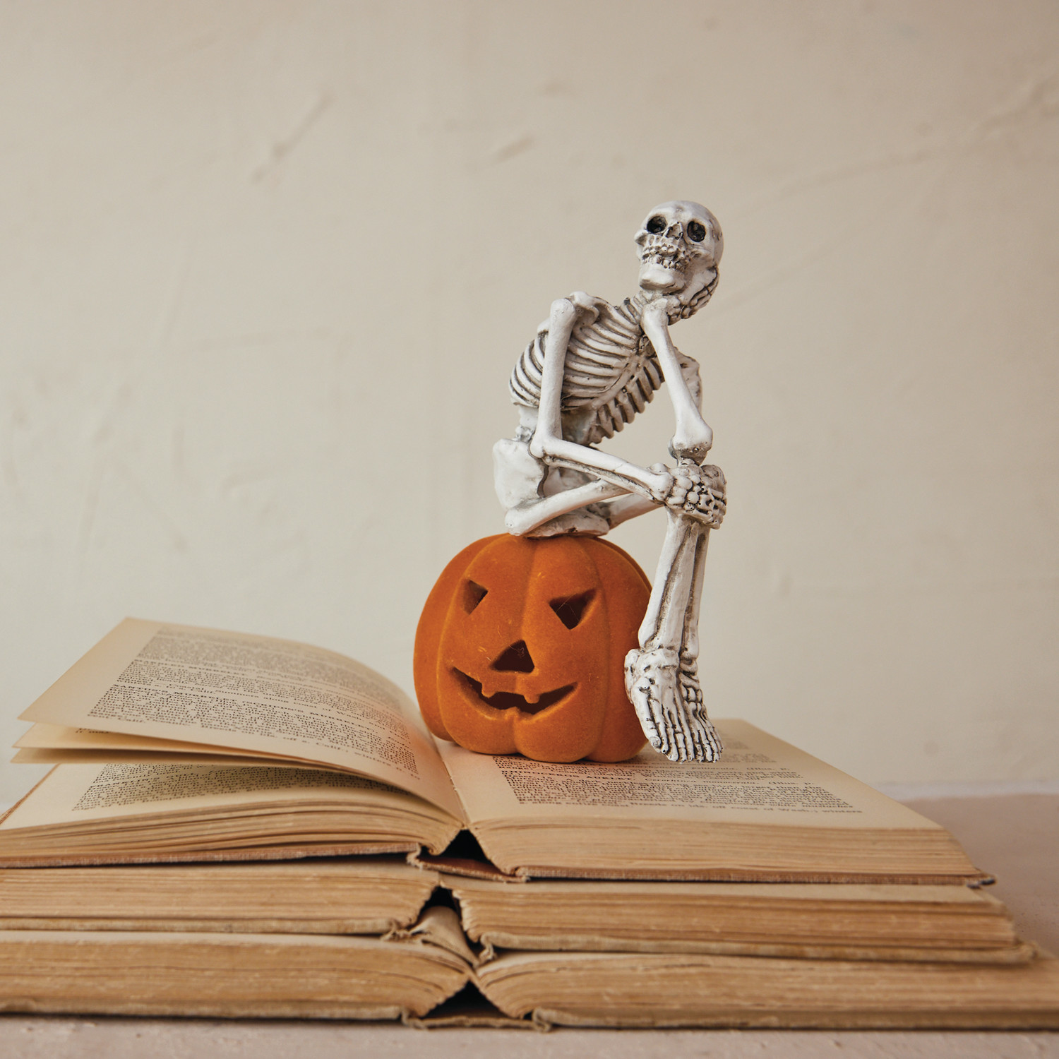 Resin Skeleton Sitting on Flocked Jack-O-Lantern