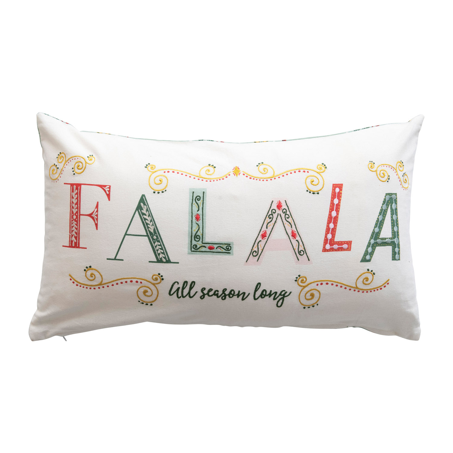 Catalog Name: 24"L x 14"H Cotton Lumbar Pillow with Patterned Back "FA LA LA All Season Long", Multi Color