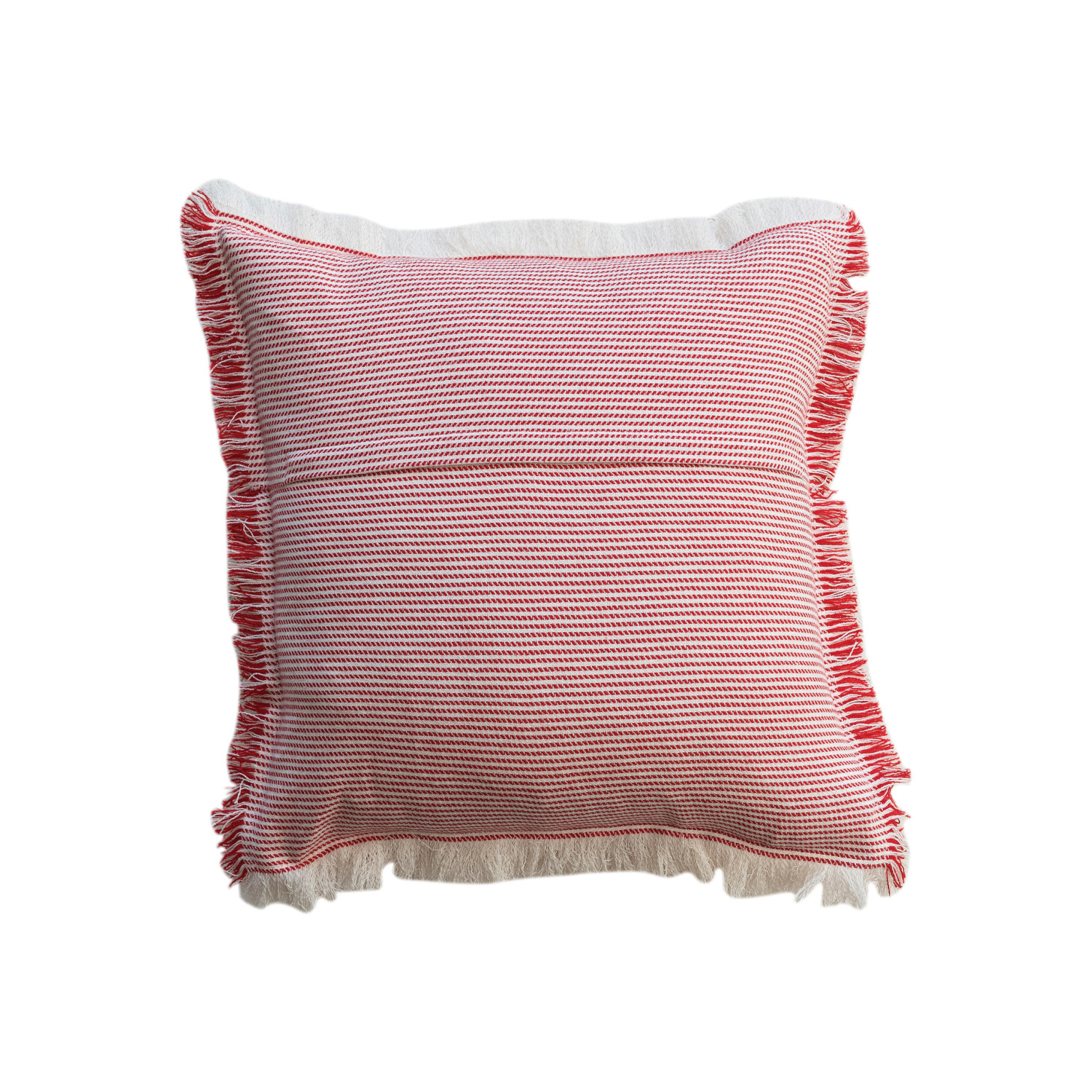 Catalog Name: 18" Square Woven Cotton Pillow w/ Stripes & Fringe, Red & White