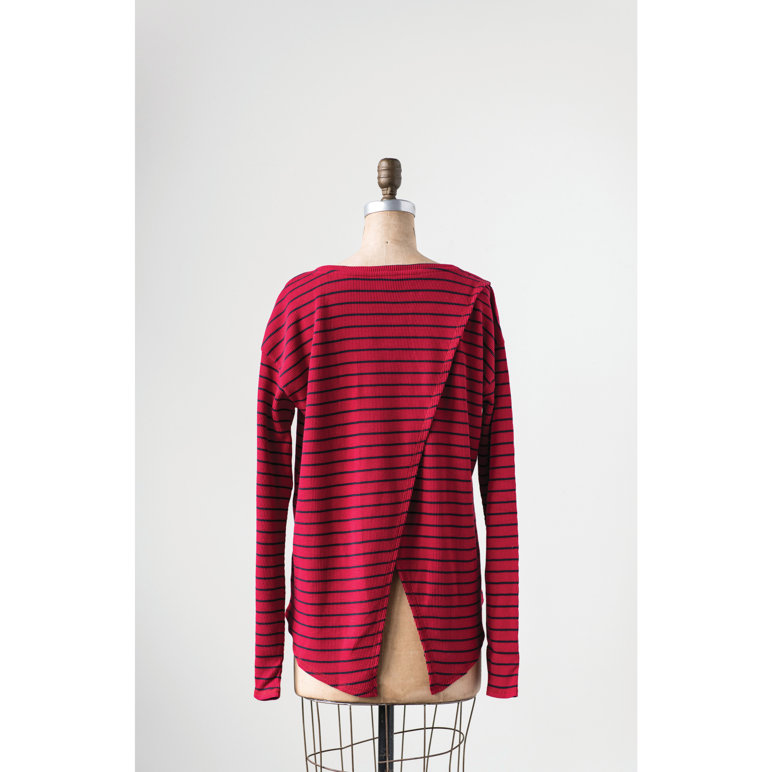Catalog Name: Cotton Waffle Riley Tee w/ Cross Back, Red w/ Navy Color Stripe, Medium