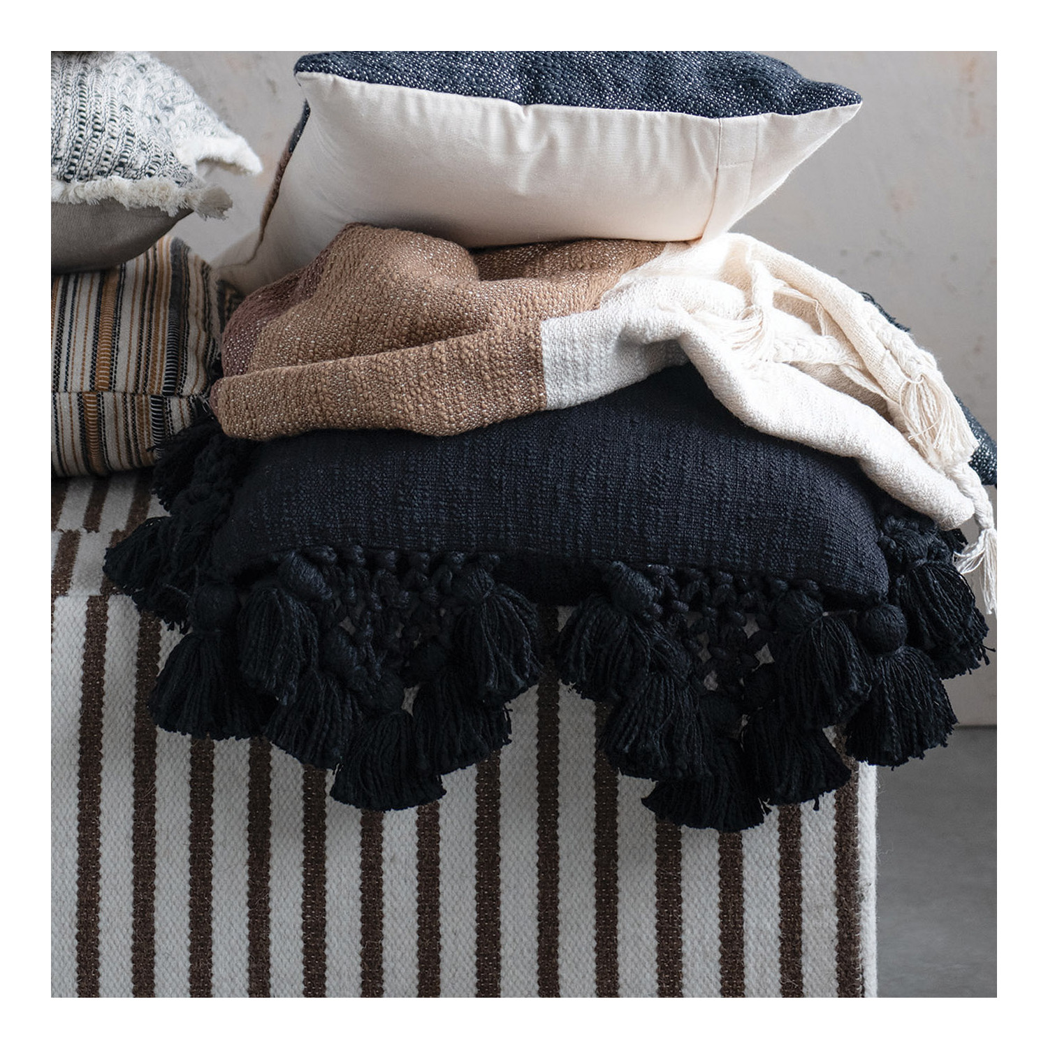 Black cotton slub lumbar pillow with crochet and tassels; Cover: 100% Cotton, Filling: 100% Polyester; 24"L x 16"W x 2"H. Prop 65 Compliant. Machine Wash Cold With Mesh Bag.