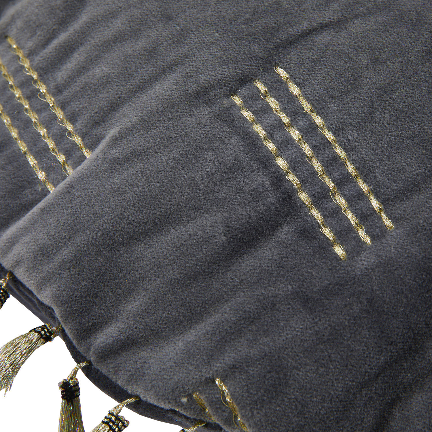 This glamorous throw pillow showcases modern metallic embroidery on luxurious cotton velvet, finished with decorative tassels. Round blue and gold cotton velvet throw pillow with metallic embroidery and tassels; Tonal cotton velvet encasement on back. Express your constantly evolving style with the simple addition of this eye-catching pillow. Removable throw pillow cover and insert; Back zipper with hidden flap; Hand wash cold, do not bleach, warm iron if needed.