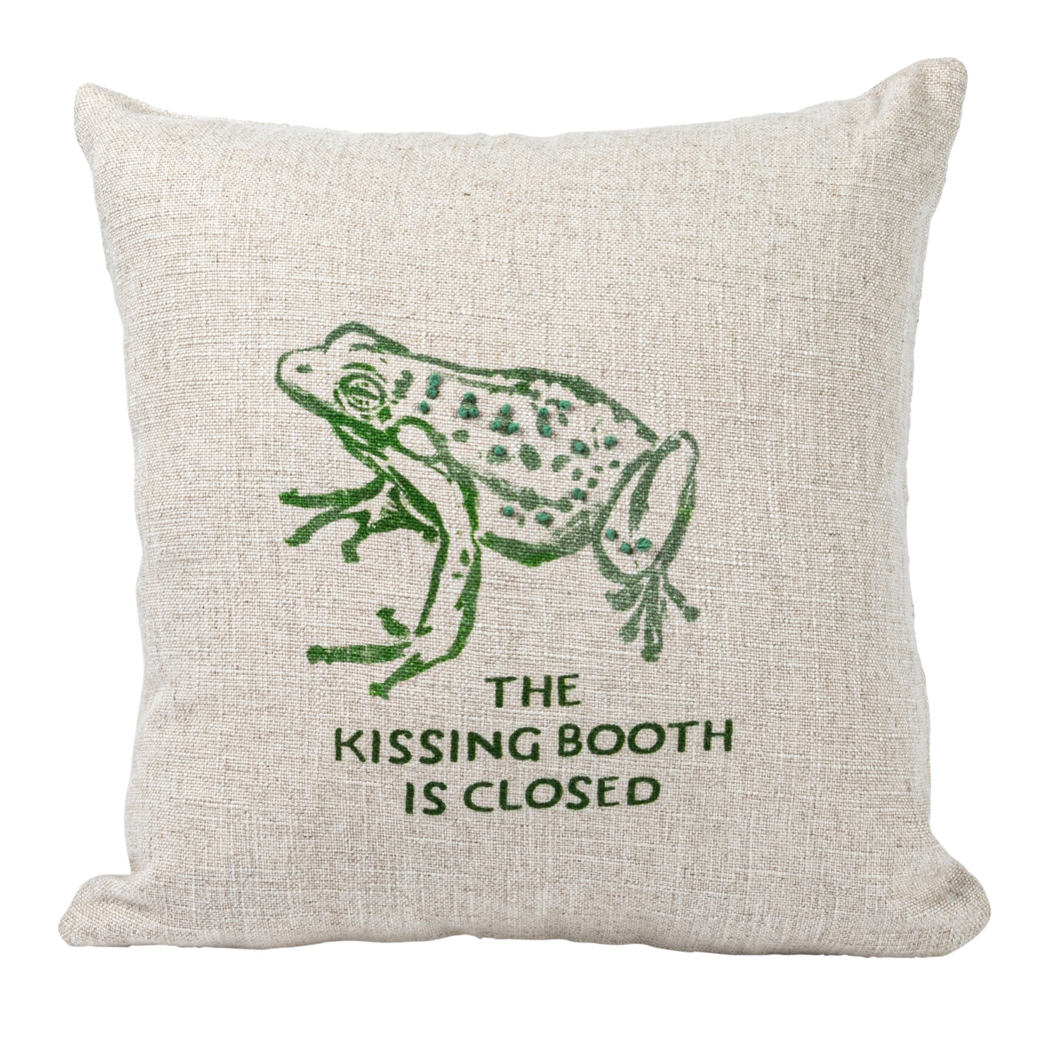 Add a whimsical touch to every home decor with the 16-inch Square Linen Blend Printed Pillow featuring an adorable frog and the playful text "The Kissing Booth is Closed", with Intricate French knots that add dimension and charm to the design. The pillow's linen blend fabric provides a soft and durable texture, while the natural and green color palette complements a variety of interior styles, and can be put on the couch, bed, or favorite chair for a delightful accent. This pillow features a rayon-linen blend cover that is comfortable and durable, and a 16-inch square shape that is versatile. This product is made of rayon and linen blend. This pillow measures 16 inches in length and 16 inches in width. Add a whimsical touch to every home decor with the 16-inch Square Linen Blend Printed Pillow featuring an adorable frog and the playful text "The Kissing Booth is Closed", with Intricate French knots that add dimension and charm to the design. The pillow's linen blend fabric provides a soft and durable texture, while the natural and green color palette complements a variety of interior styles, and can be put on the couch, bed, or favorite chair for a delightful accent. This pillow features a rayon-linen blend cover that is comfortable and durable, and a 16-inch square shape that is versatile. This product is made of rayon and linen blend.