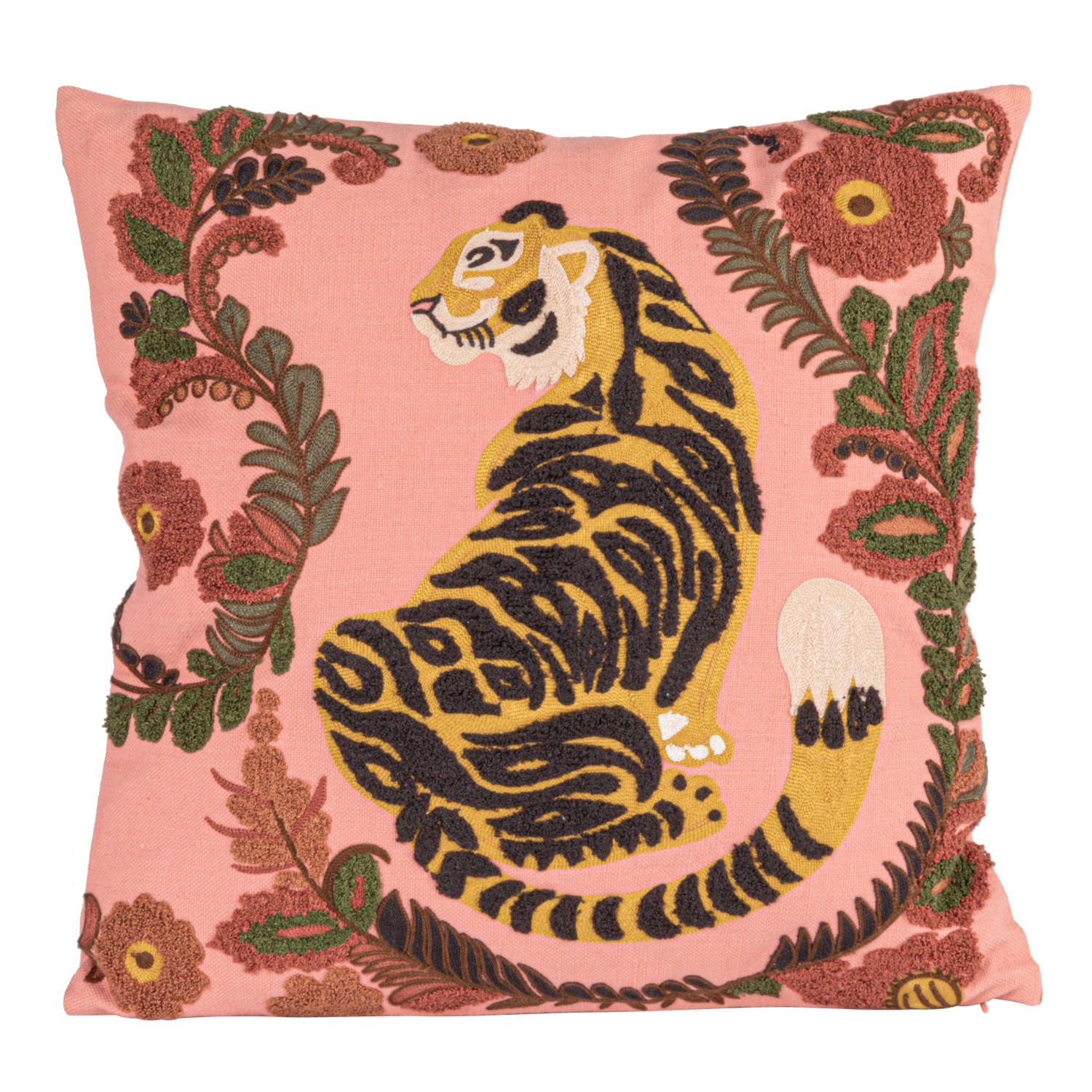 Catalog Name: 20" Square Cotton Slub Pillow w/ Embroidered Tiger & Flowers, Multi Color