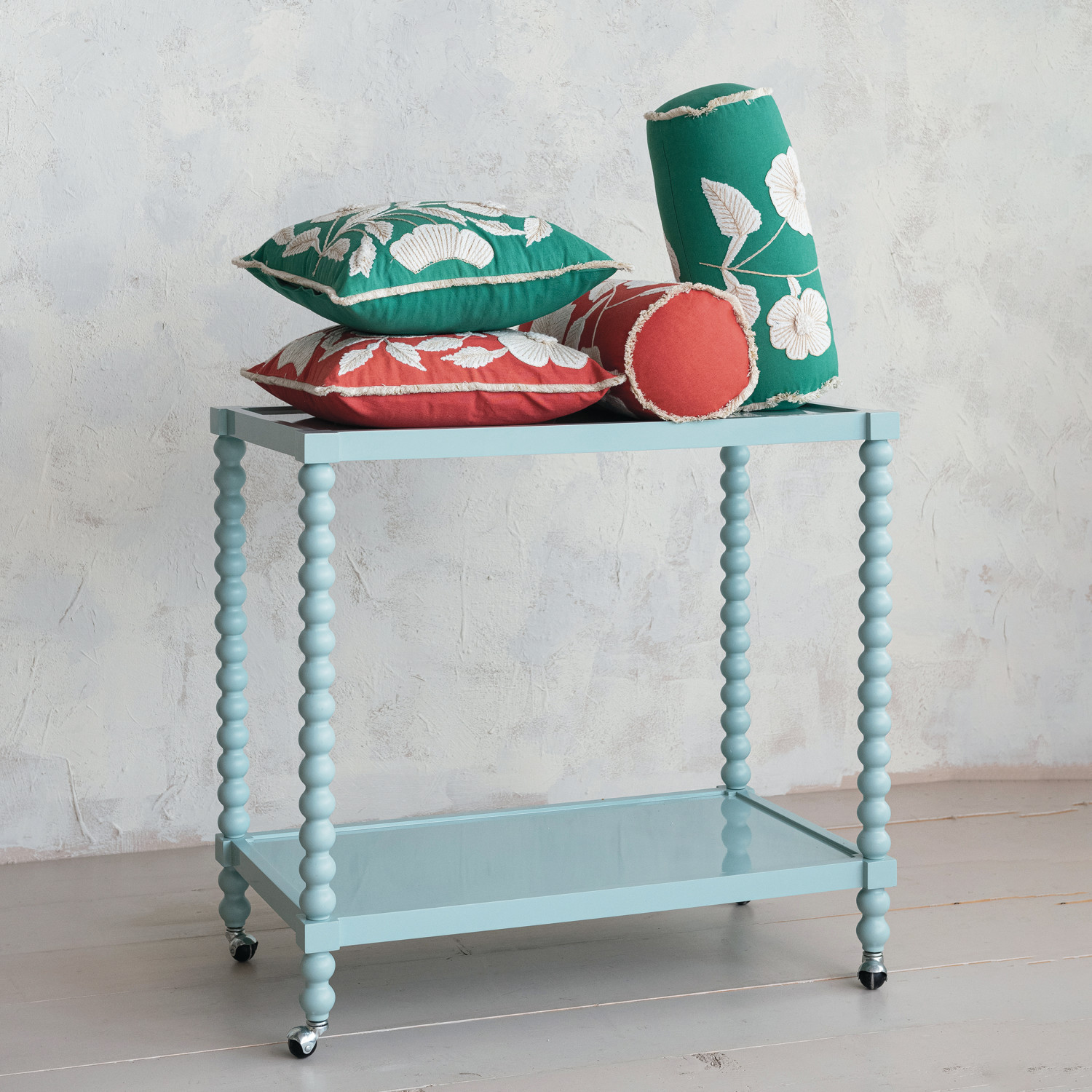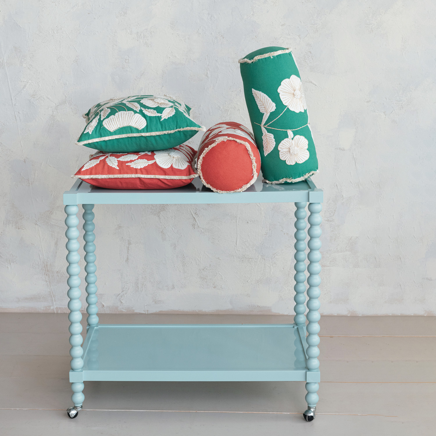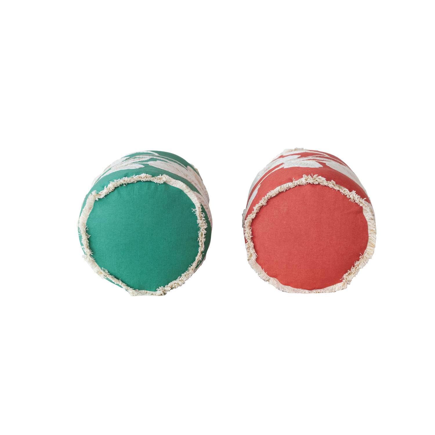 Cotton Bolster Pillow w/ Embroidered Flowers & Fringe, 2 Colors