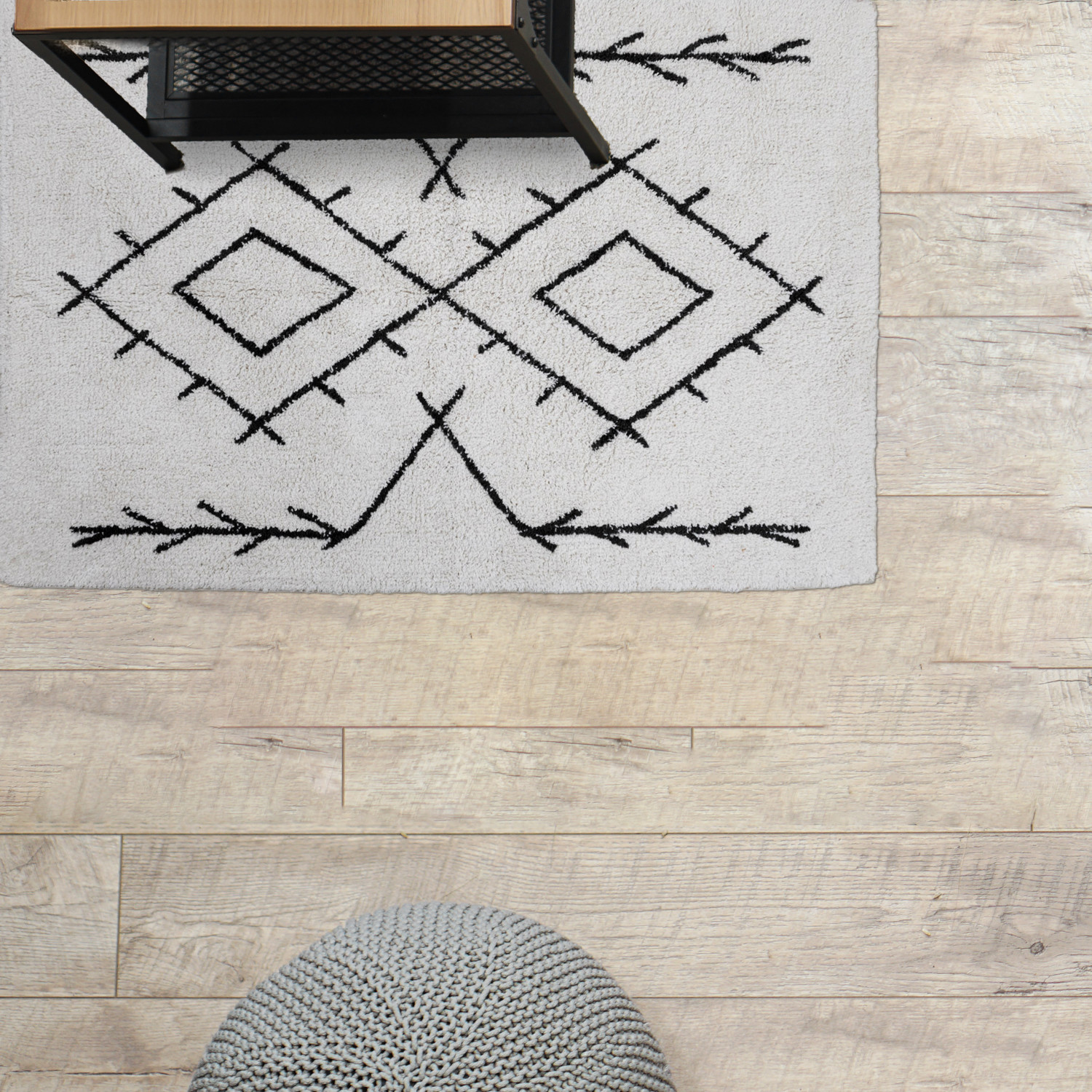 This modern boho rug showcases a geometric print on soft tufted cotton. Black and white tufted cotton geometric print rug. Spot Clean Only. 97% Cotton, 3% Other Fibers.