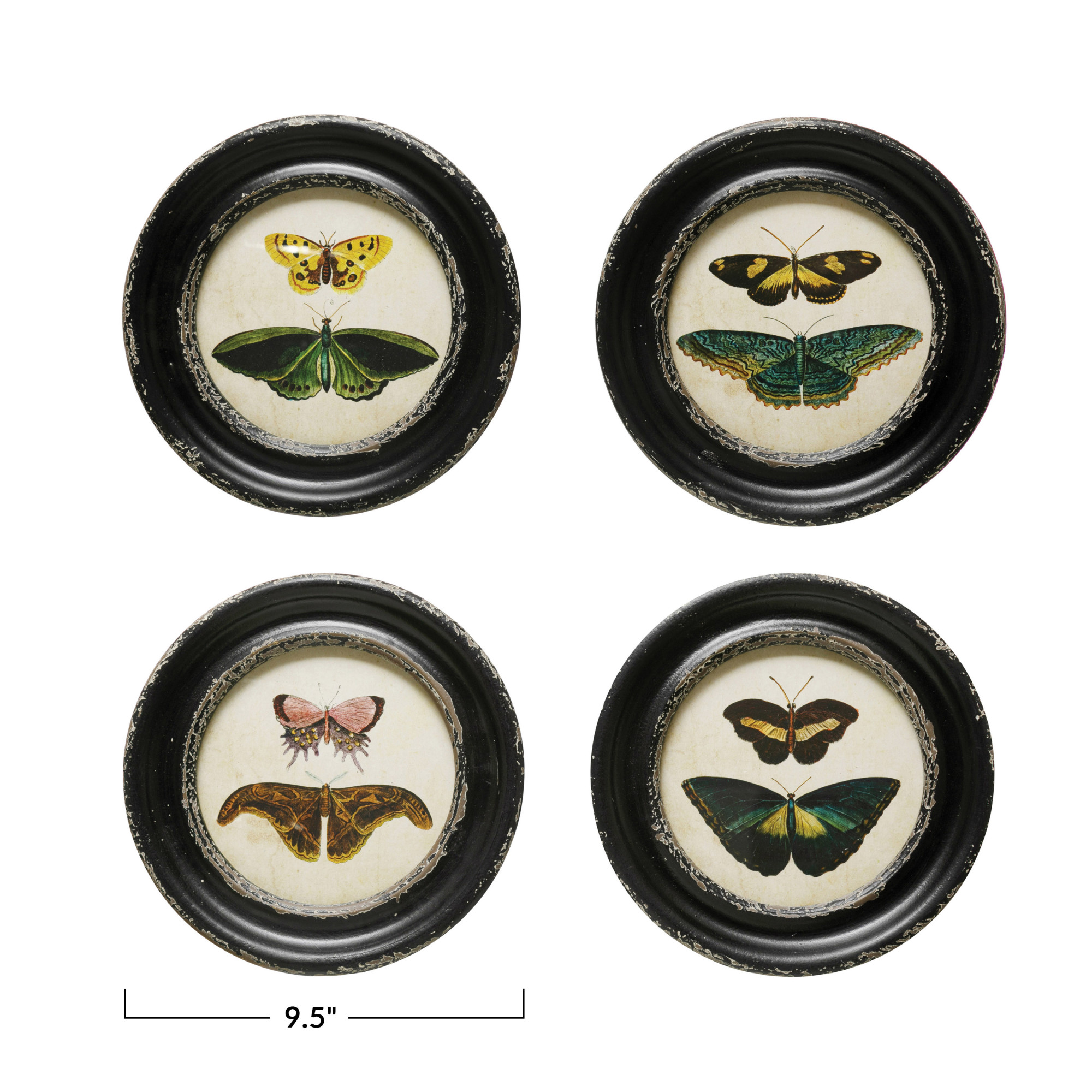 Catalog Name: 9-1/2" Round MDF Framed Glass Wall Décor w/ Vintage Reproduction Moths/Butterflies Print, Multi Color, 4 Styles