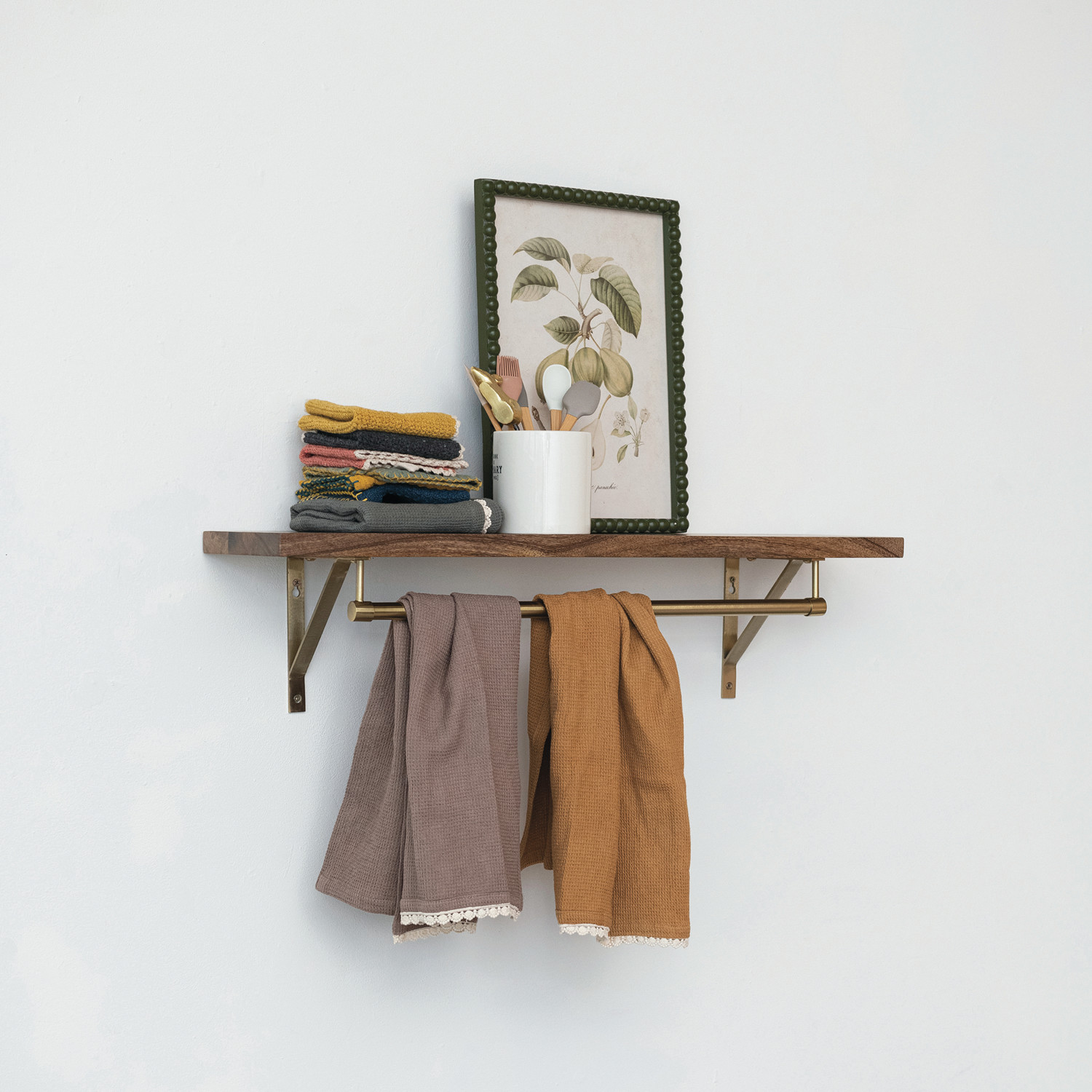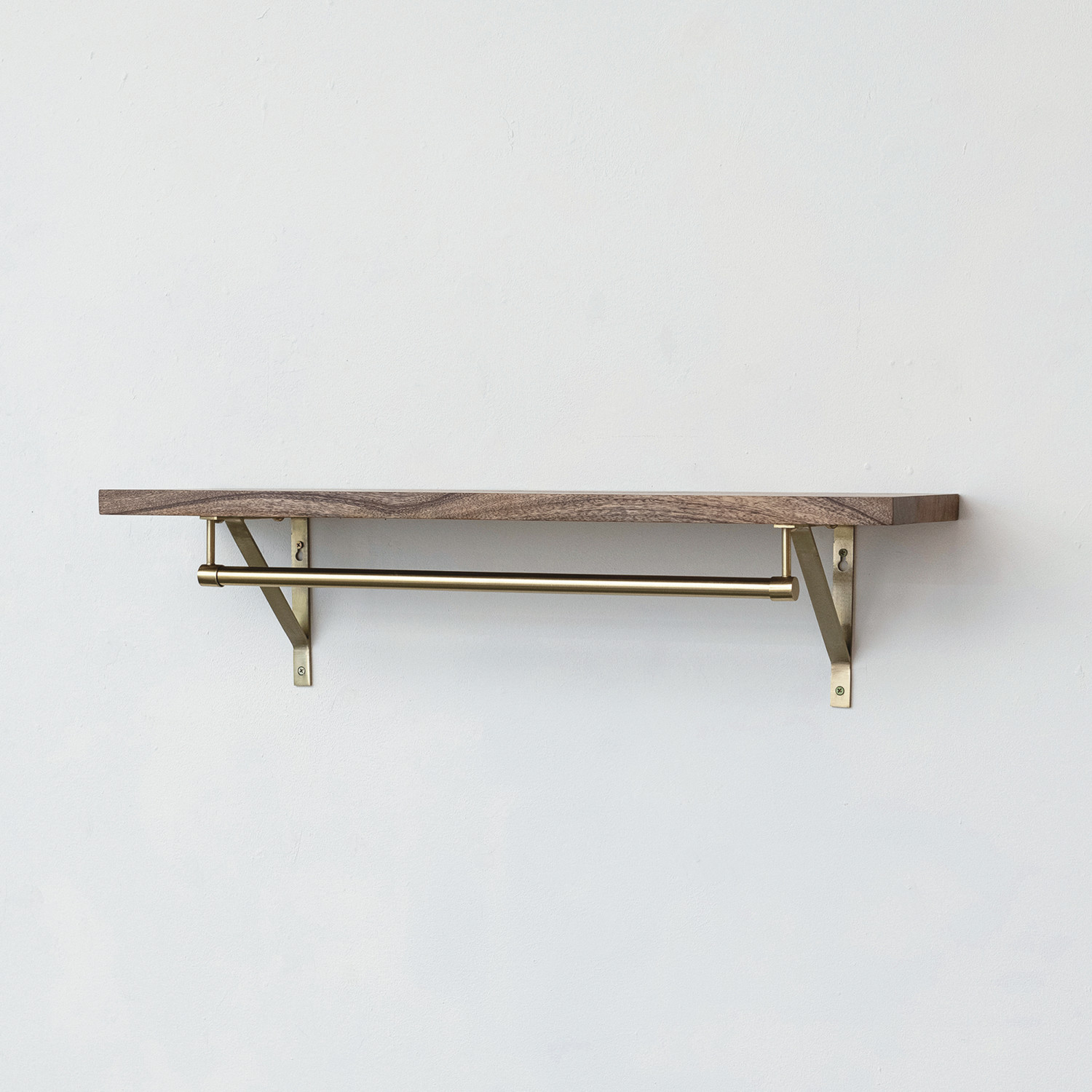 Catalog Name: 32"W x 8"D x 8"H Mango Wood & Metal Wall Shelf w/ Rod, Antique Gold Finish & Natural, KD